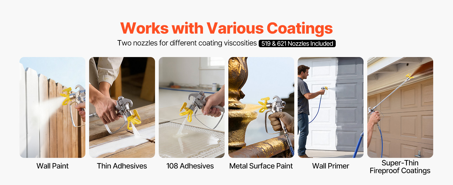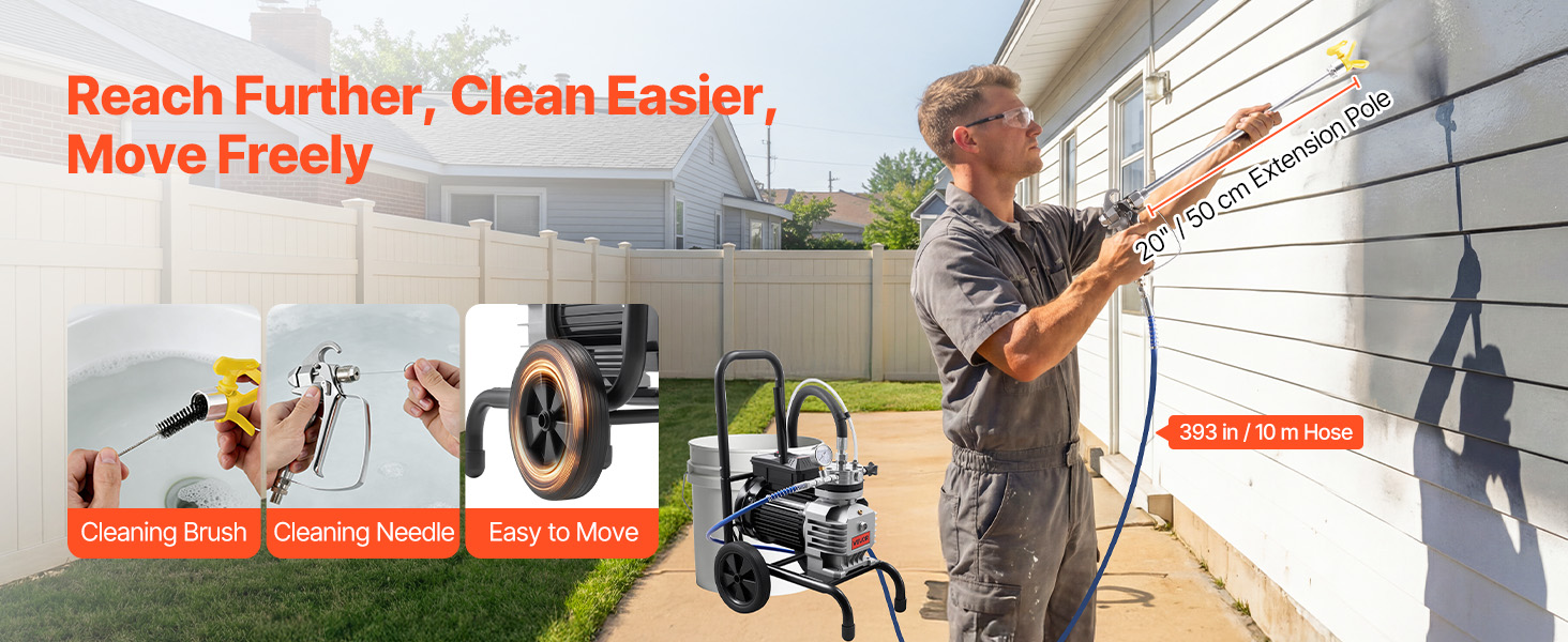 Prispôsobiteľné príslušenstvo sa prispôsobí širokej škále aplikácií na stavenisku. Tento elektrický bezvzduchový striekací stroj zefektívňuje váš pracovný postup a uľahčuje a urýchľuje čistenie.