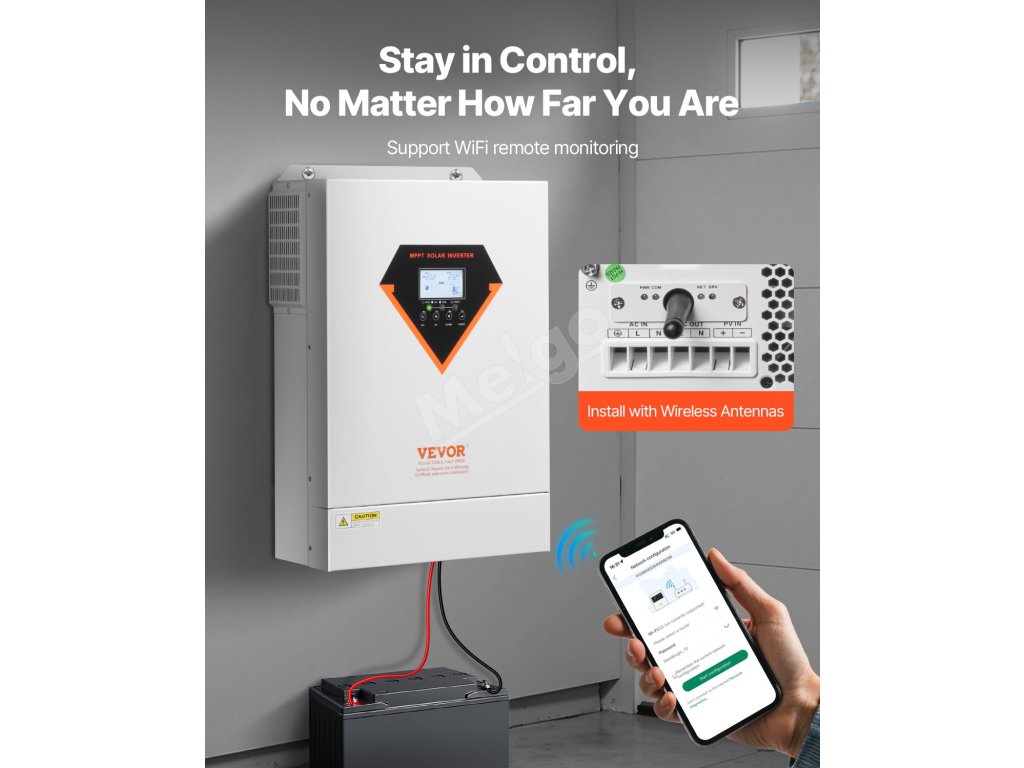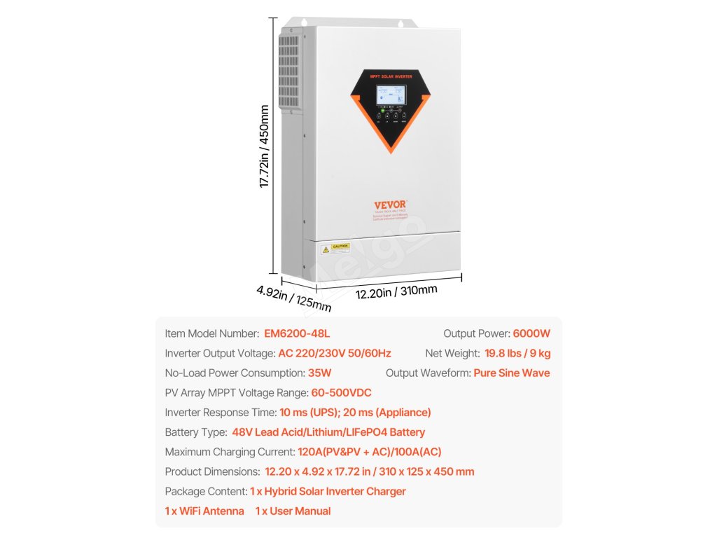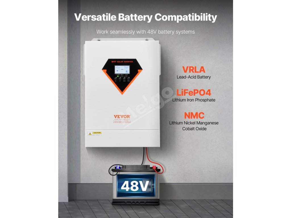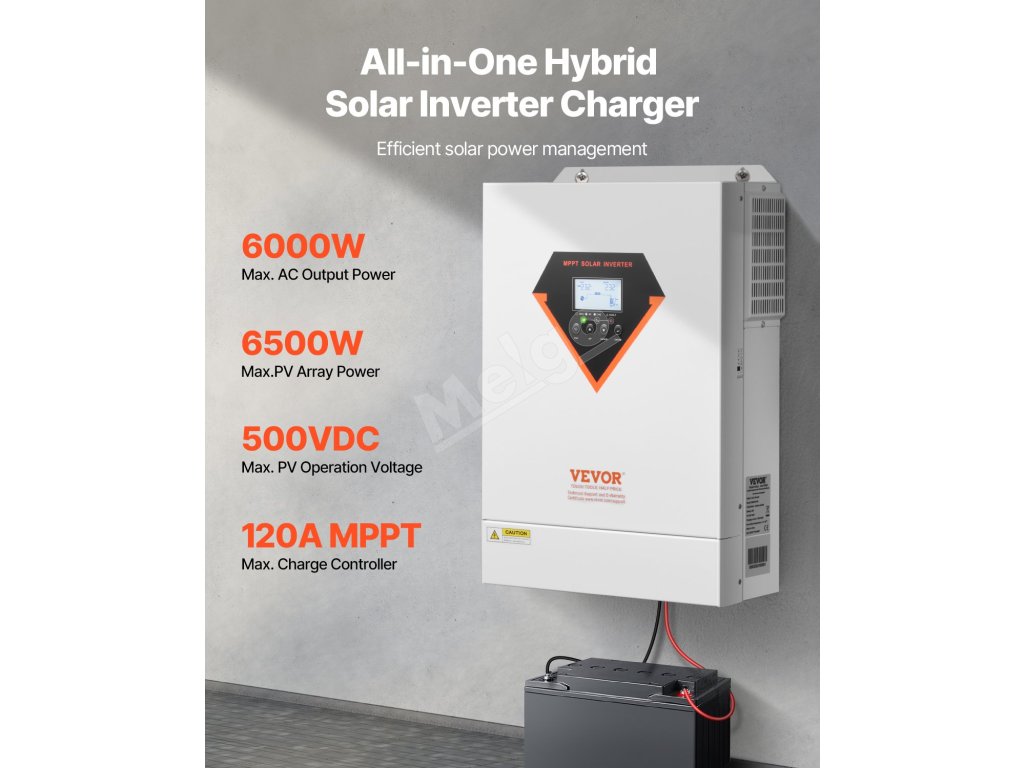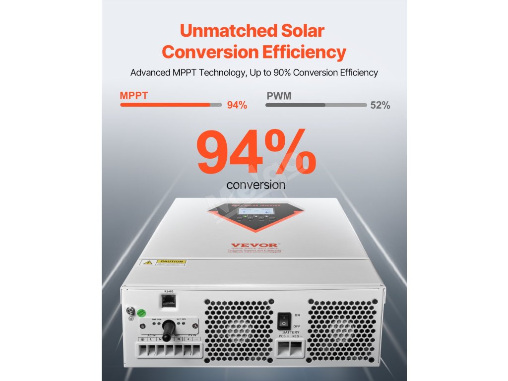 Náš regulátor hybridného solárneho striedača 2 v 1 poskytuje výkon 6000 W s čistou sínusovou vlnou a môže sa pochváliť pôsobivým špičkovým výkonom 12 000 VA. Pokročilá technológia MPPT dosahuje až 94 % účinnosť konverzie. Je kompatibilný s lítiovými, olovenými a LiFePO4 batériami a má funkciu aktivácie lítiových batérií.