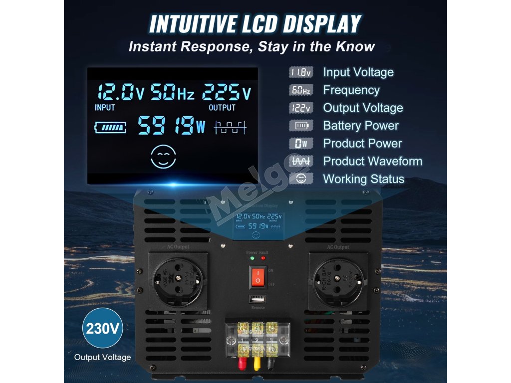 Menič čistý sínus 5000 W 12 V→230 V s lcd a usb pre auto, karavan
