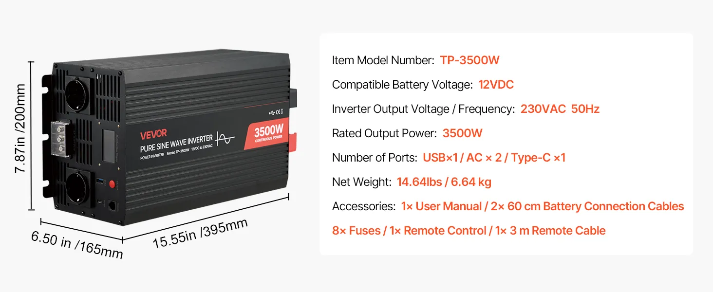 Menič napätia 12V na 230V 3500W čistá sínusová, lcd, 2×ac, usb, usb-c