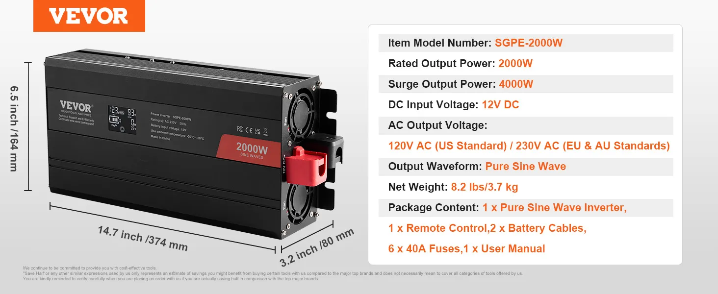 Menič napätia 2000 watt DC 12V na AC 230V, 2× AC, 2× USB, 1× USB‑C