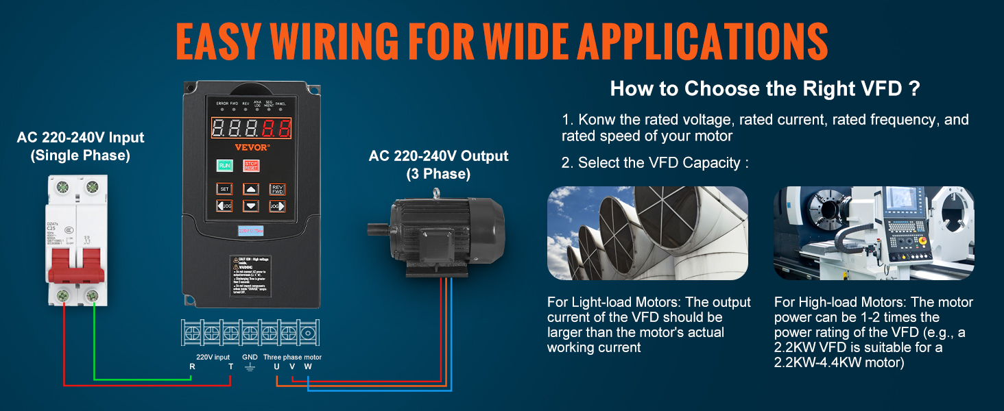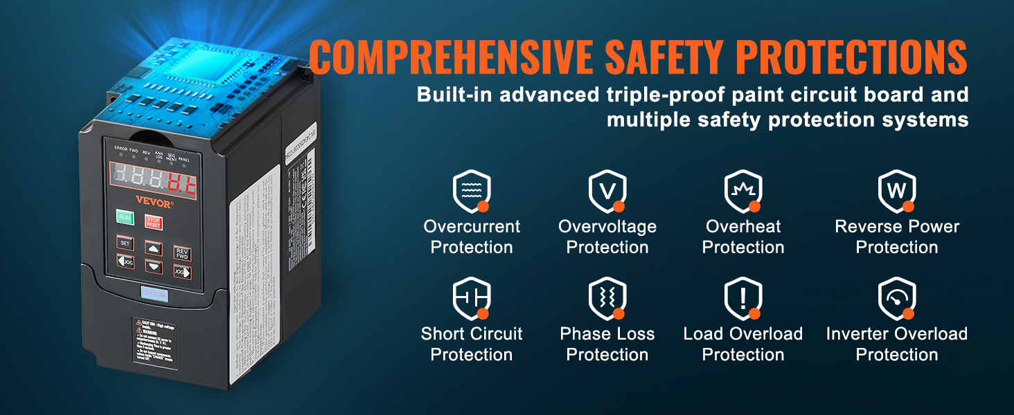 Náš VFD je vybavený inteligentným systémom ochrany, ktorý poskytuje bezpečnosť proti nadprúdu, preťaženiu, prepätiu a strate fázy. Vyrobený je prevažne z nehorľavého ABS, čo zaručuje vysoký výkon a kvalitu zvnútra a poskytuje vám pokoj počas používania.