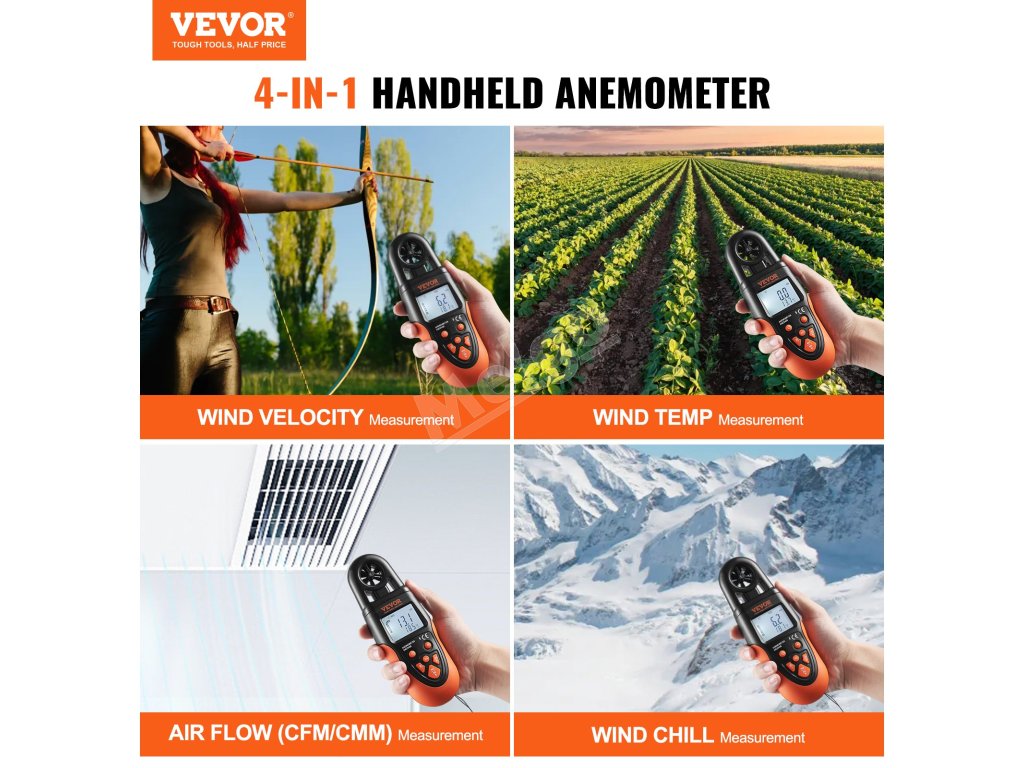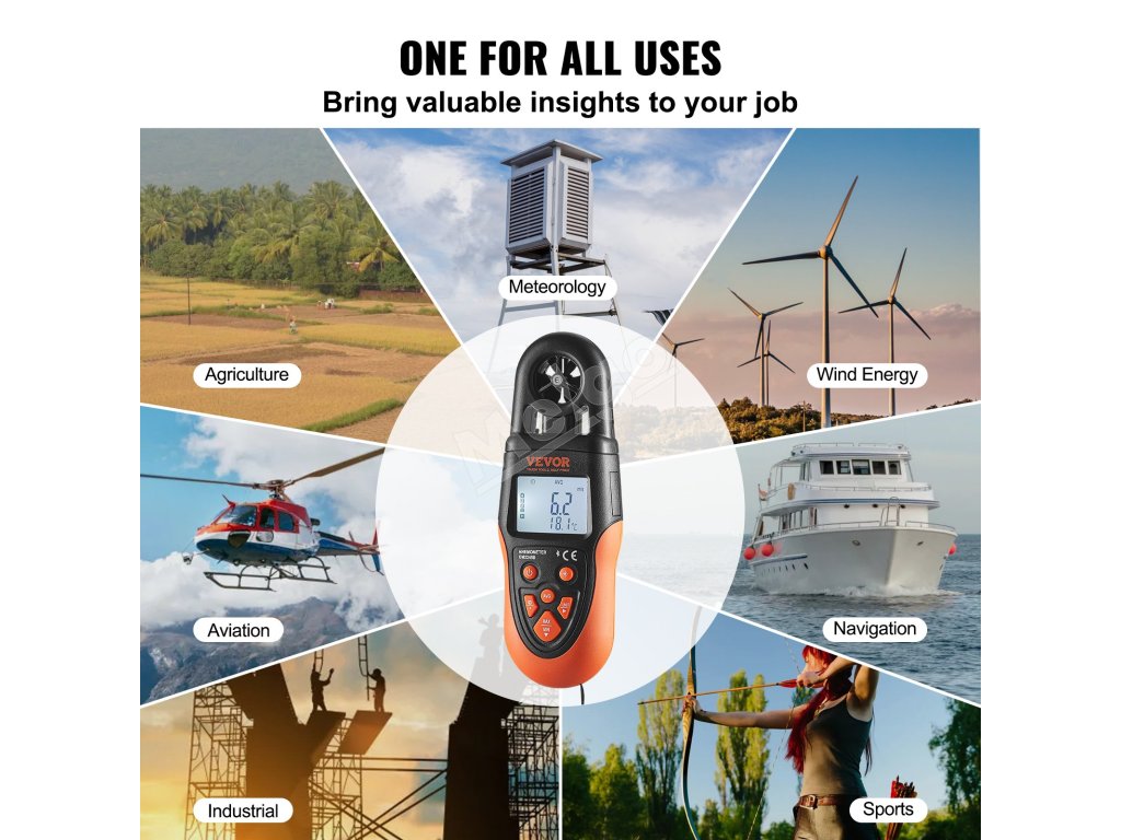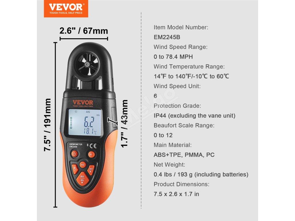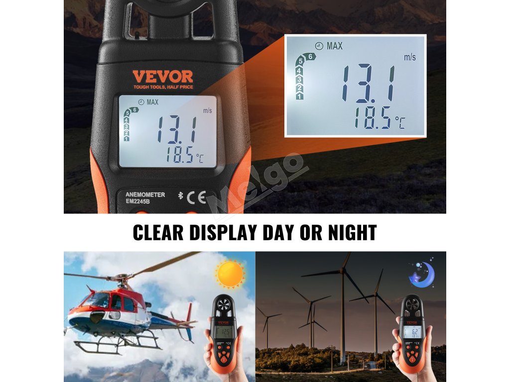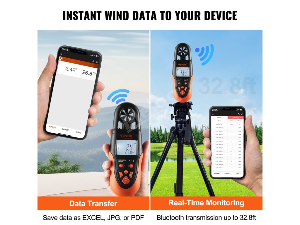 Náš merač rýchlosti vetra 4 v 1 meria rýchlosť vetra, teplotu vetra, prúdenie vzduchu a chlad vetra. Vodotesnosť IP44 (okrem lopatkovej jednotky), 6 jednotiek rýchlosti vetra, displej s LED podsvietením, má pre vás všetko! Využite silu Bluetooth na okamžitý prenos údajov, pozdvihnite svoju hru na meranie vetra!