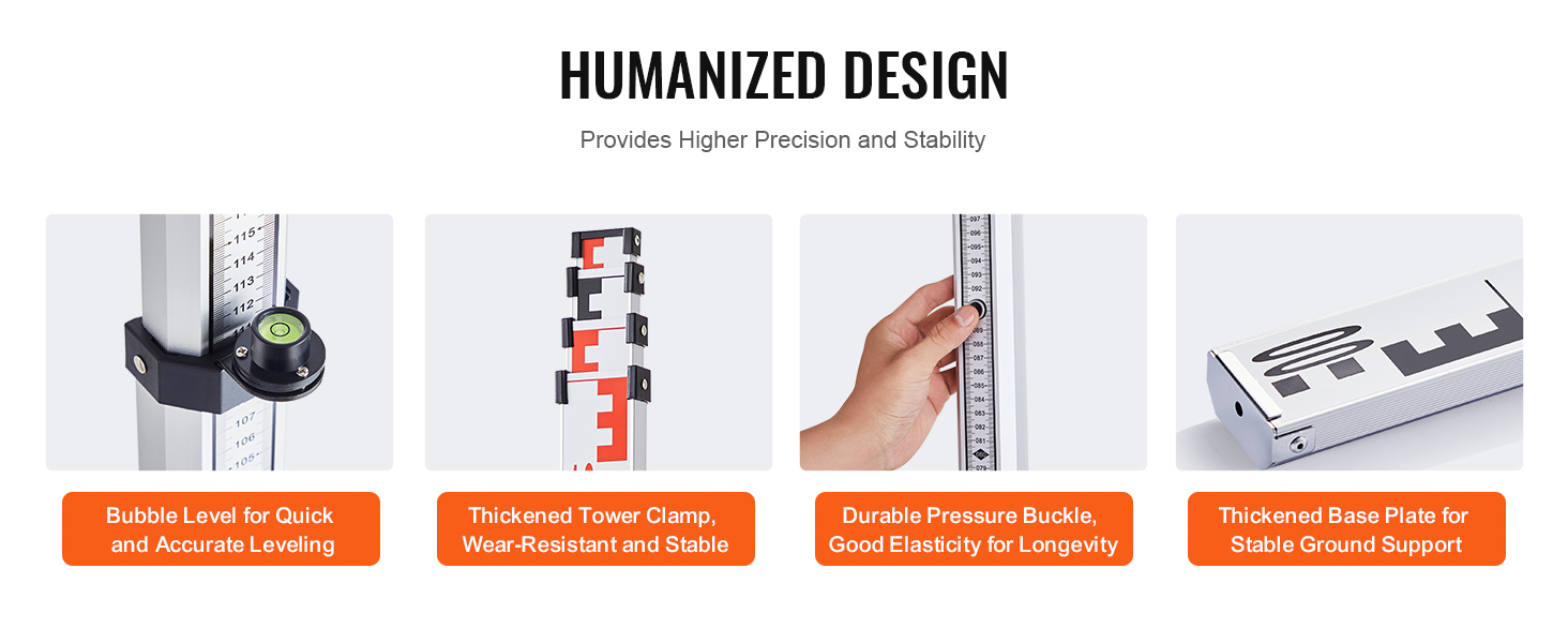 Triediaca tyč VEVOR vyrobená z robustného hliníka je ľahká a skladacia na jednoduchú prepravu a skladovanie. Je vybavená presnými značkami na presné vyrovnanie, ktoré sú ideálne na architektonické laserové a optické merania.