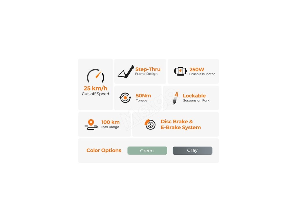 Vypínacia rýchlosť 25 km/h | Konštrukcia rámu Step-Thru | 250W bezkefový motor | Krútiaci moment 50 Nm | Odpružená vidlica s možnosťou uzamknutia