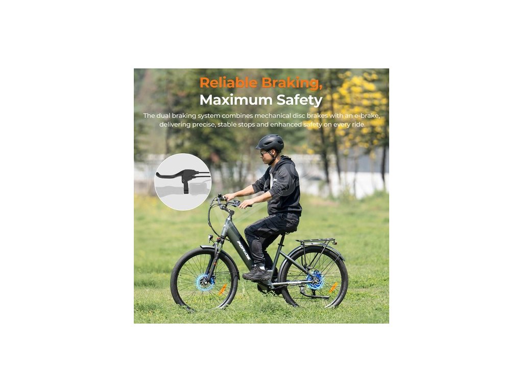 Jezdite s istotou pomocou citlivých kotúčových bŕzd a elektronickej brzdy pre lepšiu kontrolu a bezpečnosť pri každom dobrodružstve, vďaka čomu sa môžete ľahko a s istotou pohybovať po rôznych cestách. Svetelný systém s certifikátom StVZO zvyšuje viditeľnosť počas nočných jázd, zatiaľ čo pneumatiky s rozmermi 27,5" x 2,1" poskytujú stabilný a tlmený zážitok v mestských uliciach aj na cestách v teréne.