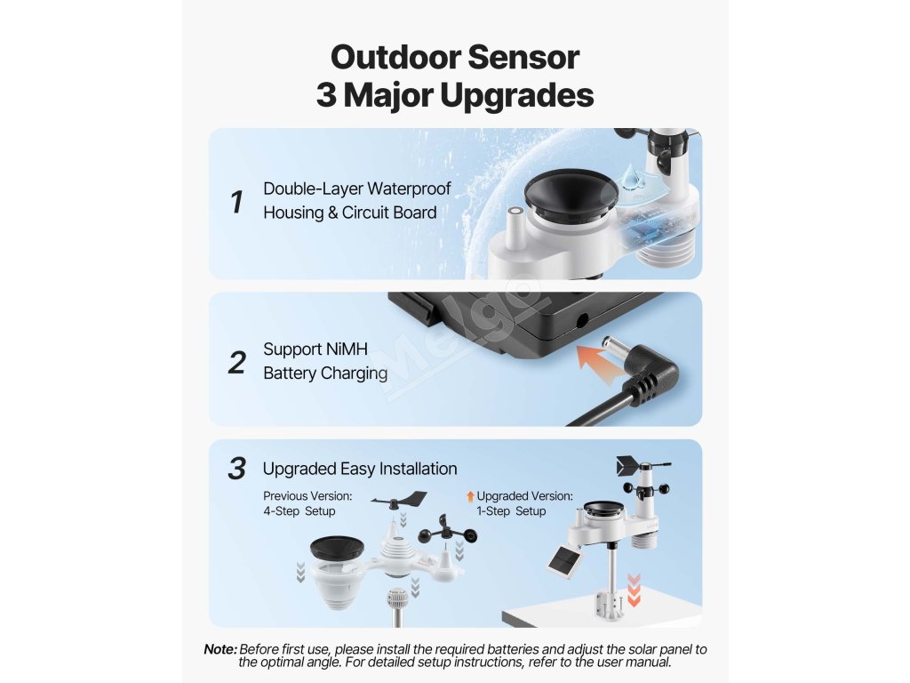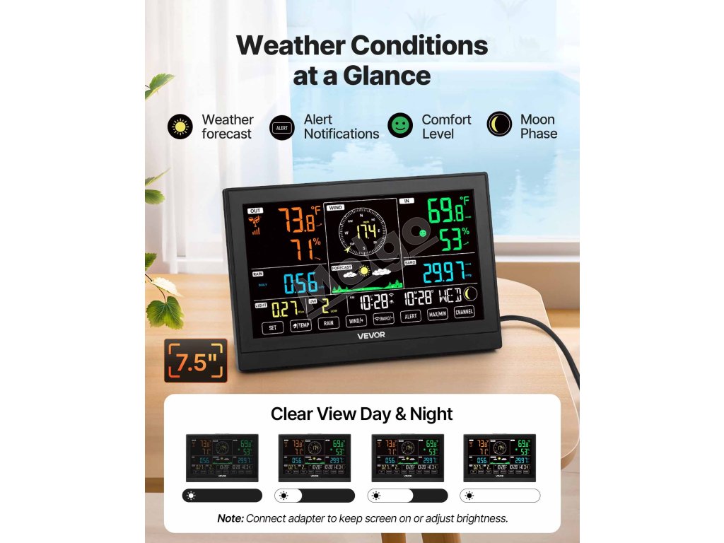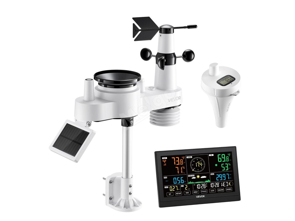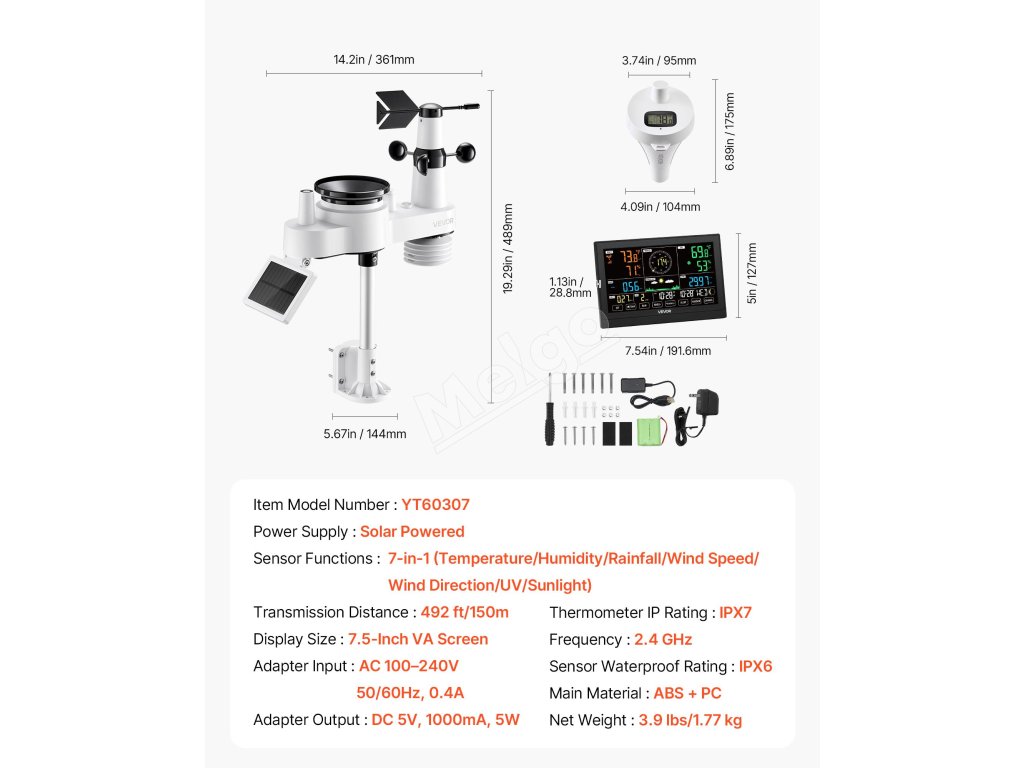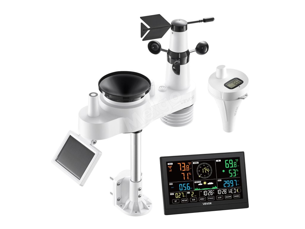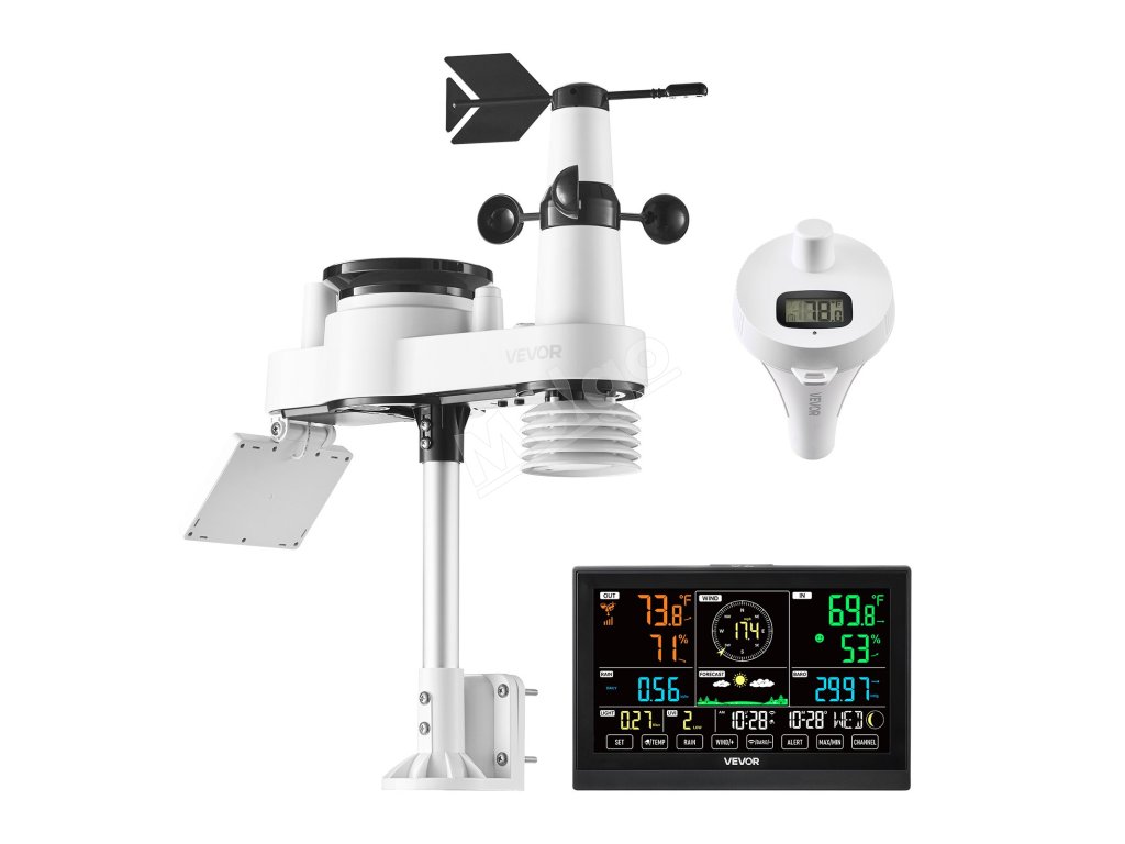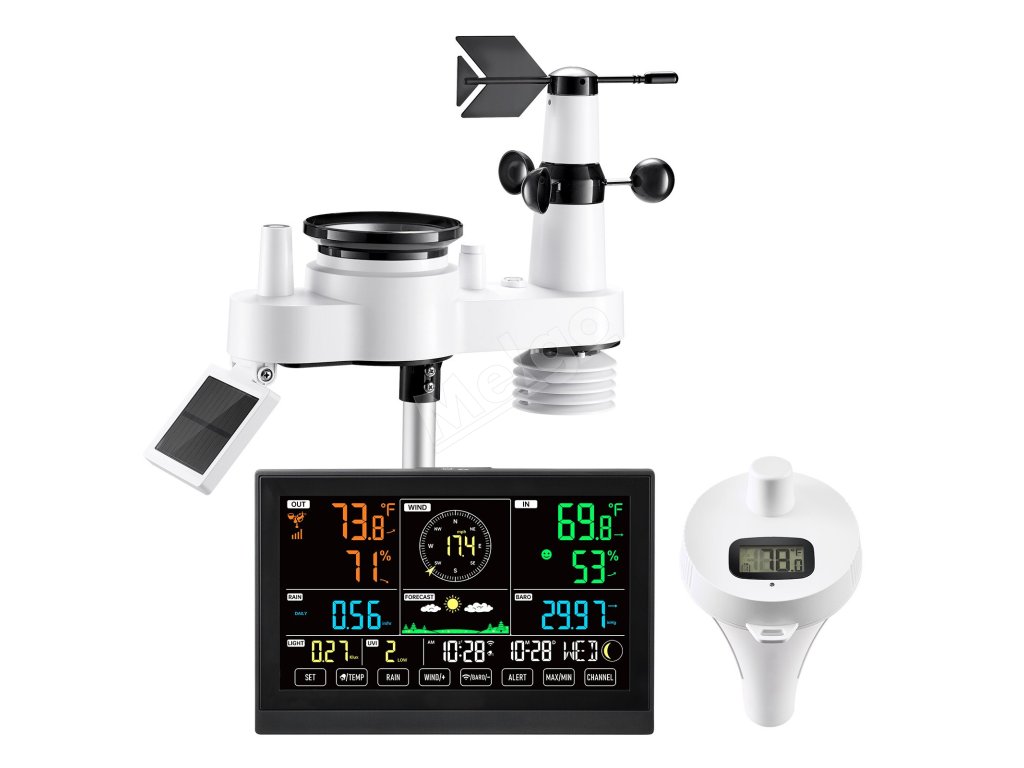 Naša meteorologická stanica monitoruje teplotu, vlhkosť, zrážky, rýchlosť/smer vetra a obsahuje bazénový teplomer na presné sledovanie teploty vody. Všetky údaje sú prehľadné vďaka 7,5-palcovému displeju. bezdrôtový prenos 492 stôp (150 m) pre vonkajší senzor a 328 stôp (100 m) pre bazénový teplomer.