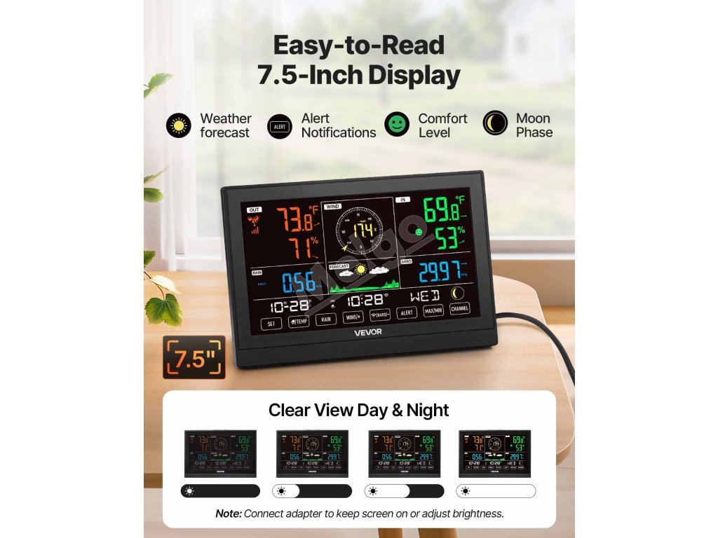 Naša bezdrôtová meteorologická stanica monitoruje teplotu, vlhkosť, zrážky, rýchlosť a smer vetra - všetky údaje sú prehľadné vďaka 7,5-palcovému displeju. Vďaka dosahu bezdrôtového prenosu 492 stôp (150 m) a vodotesnému vonkajšiemu snímaču IPX6 sa hodí do exteriéru a je efektívne napájaná solárnymi panelmi.