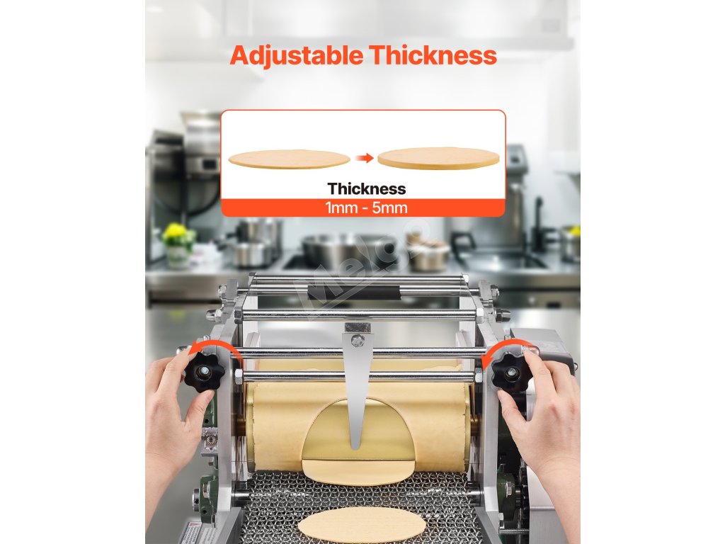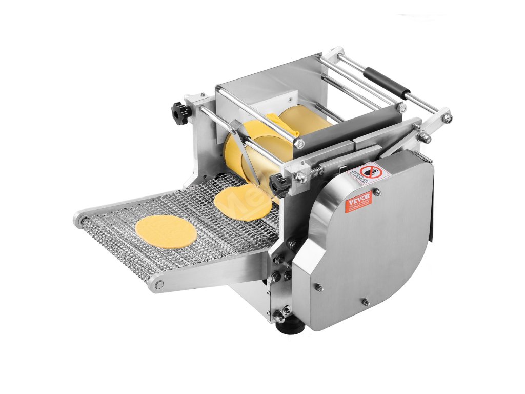 Tento automatický stroj na výrobu kukuričných tortill vyrobí až 1 400 kusov za hodinu, čo je oveľa efektívnejšie ako ručná práca. Je vybavený 4-palcovými a 6-palcovými valcami s nastaviteľnou hrúbkou (1-5 mm), ideálny pre domácnosti, pojazdné reštaurácie a kaviarne.