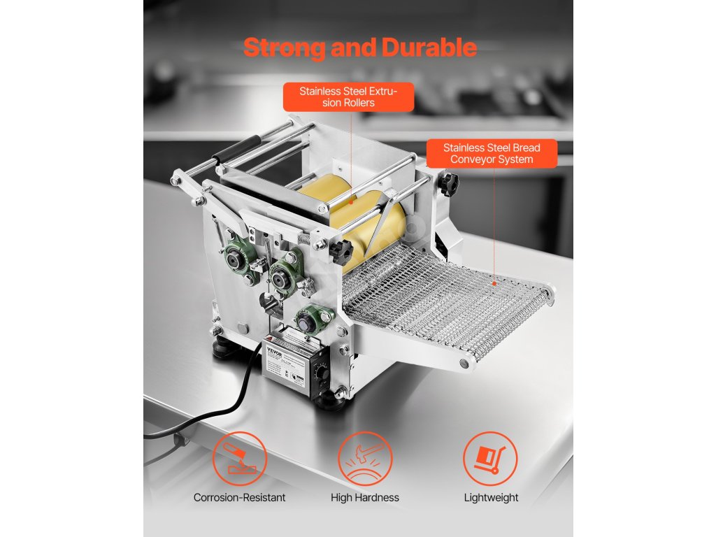 Lisovacie valce a dopravný pás sú vyrobené z potravinárskej nehrdzavejúcej ocele s teflónovou nepriľnavou vrstvou, ktorá zabraňuje prilepeniu cesta a zabezpečuje neporušené tortilly. Čistenie je bezproblémové, čo znižuje nároky na údržbu po použití.