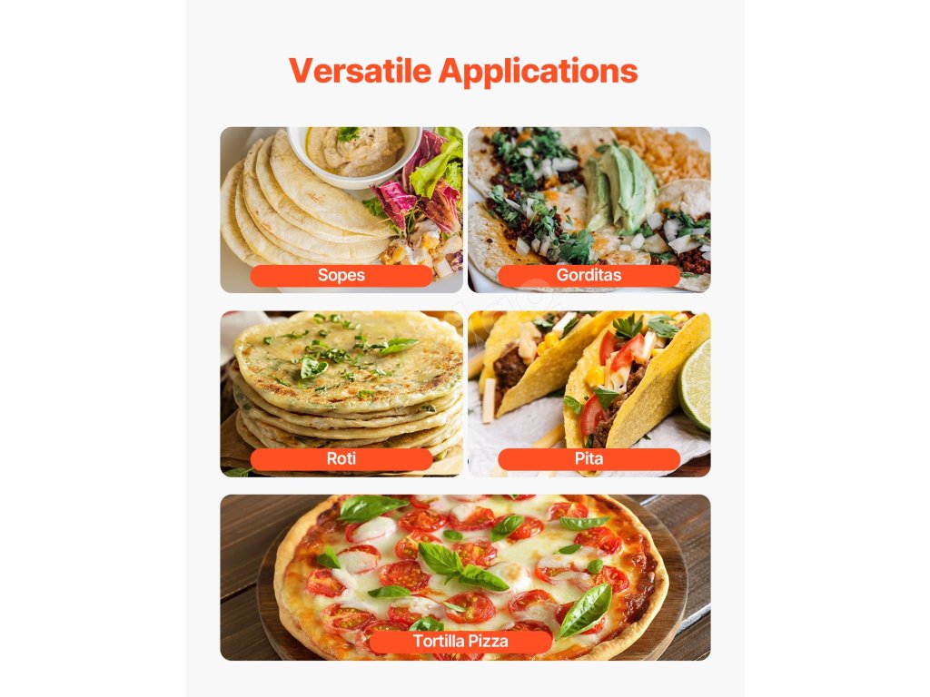 Tento stroj na tortilly nie je určený len na tortilly - môžete v ňom tiež vytvárať Sopes, Gorditas, Roti, Pita, Tortilla Pizza a ďalšie. Je ideálny na domáce aj komerčné použitie a hodí sa do rôznych prostredí, ako sú domácnosti, pojazdné predajne potravín, predajne rýchleho občerstvenia a školské jedálne.