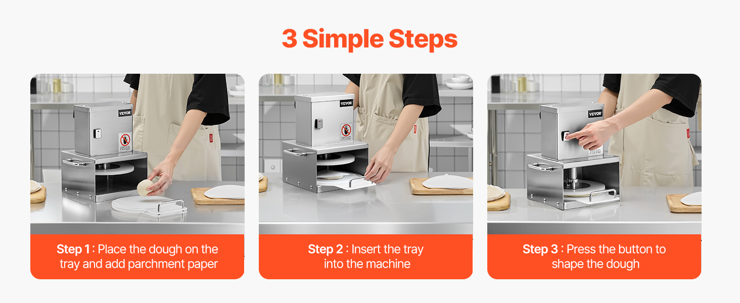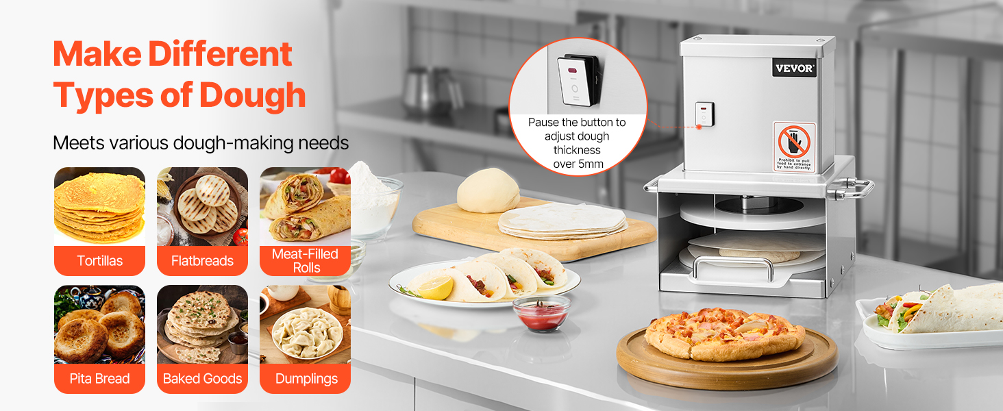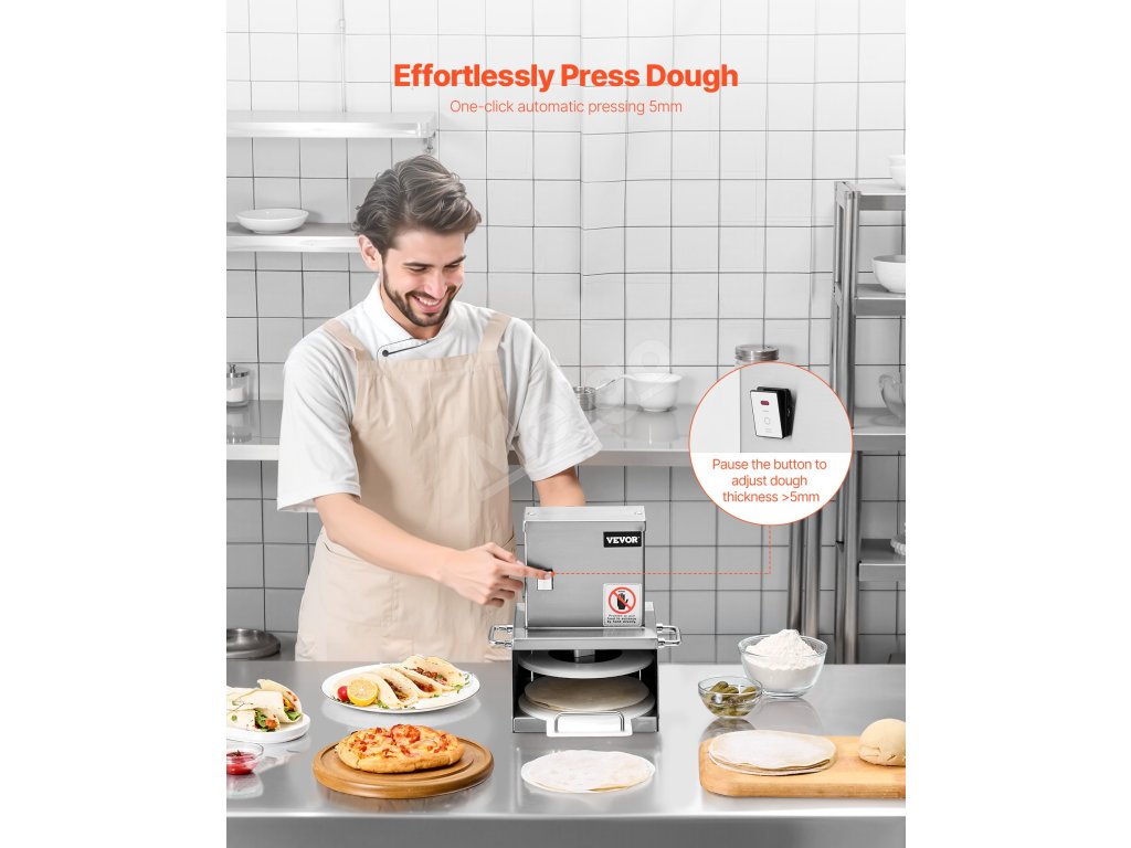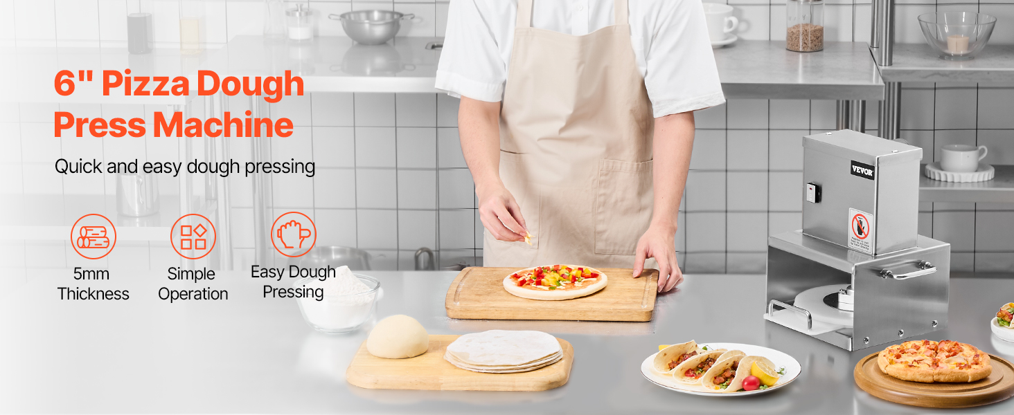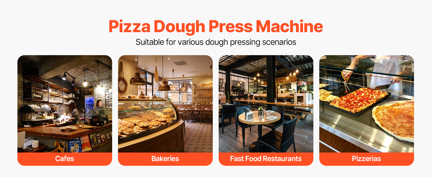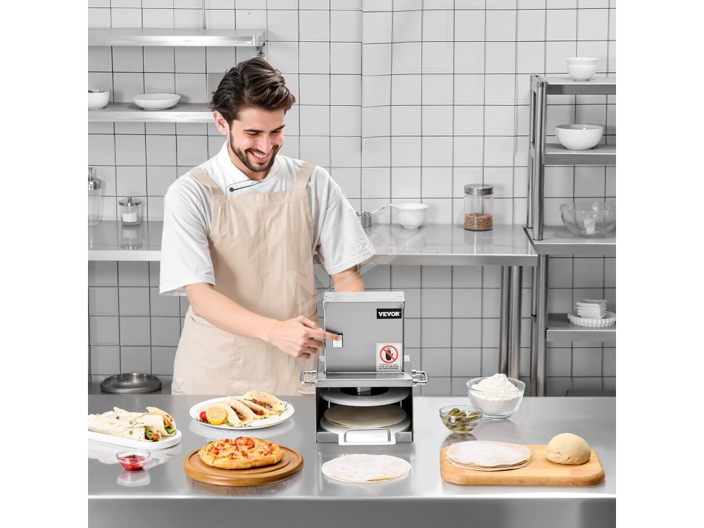 Tento komerčný nástroj na lisovanie pizze je vhodný na prípravu tortilly, pizze a pečiva. Je ideálny na ľahké komerčné použitie, napríklad v kaviarňach, pekárňach, reštauráciách rýchleho občerstvenia a pizzeriách.