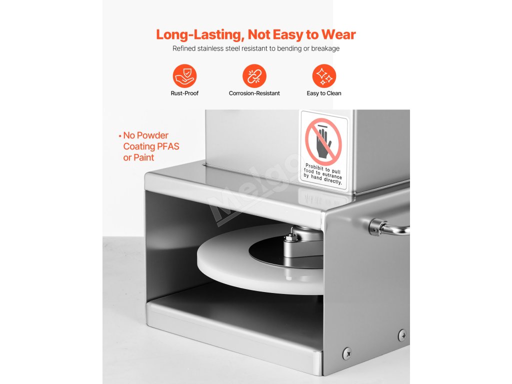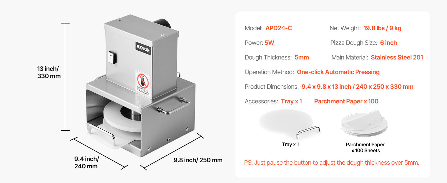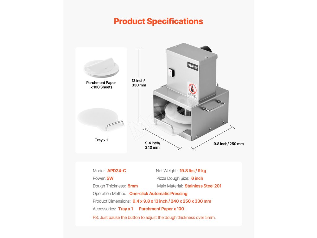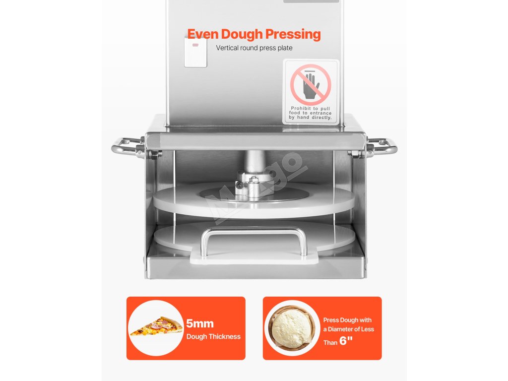 Tento elektrický lis na pizzu dokáže lisovať cesto až do veľkosti 6 palcov a hrúbky 5 mm. Vertikálna konštrukcia zabezpečuje rovnomerné lisovanie cesta a jednoduché tvarovanie rôznych druhov cesta.