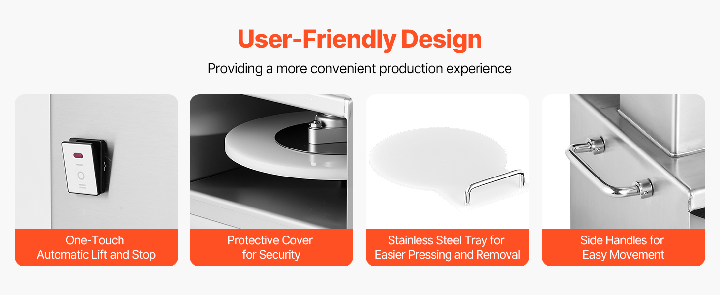 Elektrický stroj na tvarovanie pizze je vybavený funkciami automatického zdvihu a zastavenia jedným dotykom, čo uľahčuje lisovanie. Rozšírená základňa poskytuje lepšiu stabilitu a vysokopevnostná pružina zaisťuje automatický odraz, čím ponúka pohodlnejšie lisovanie.