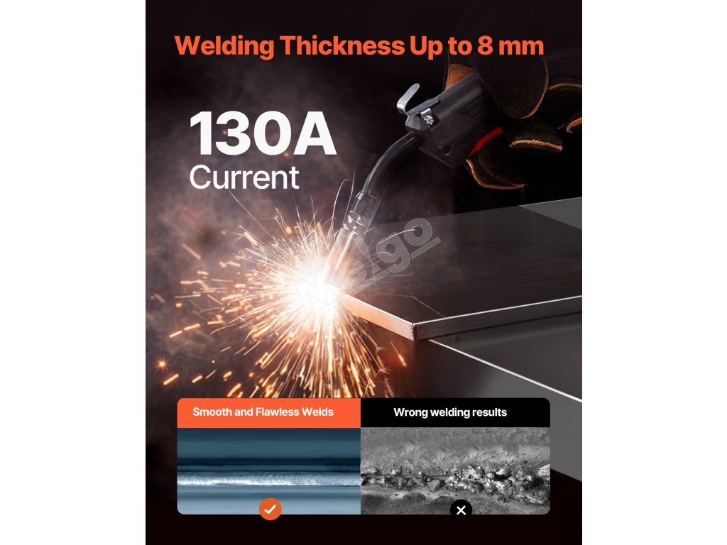 Táto zváračka poskytuje silný výstupný prúd 130 A, ktorý jej umožňuje zvárať materiály s hrúbkou až 8 mm.