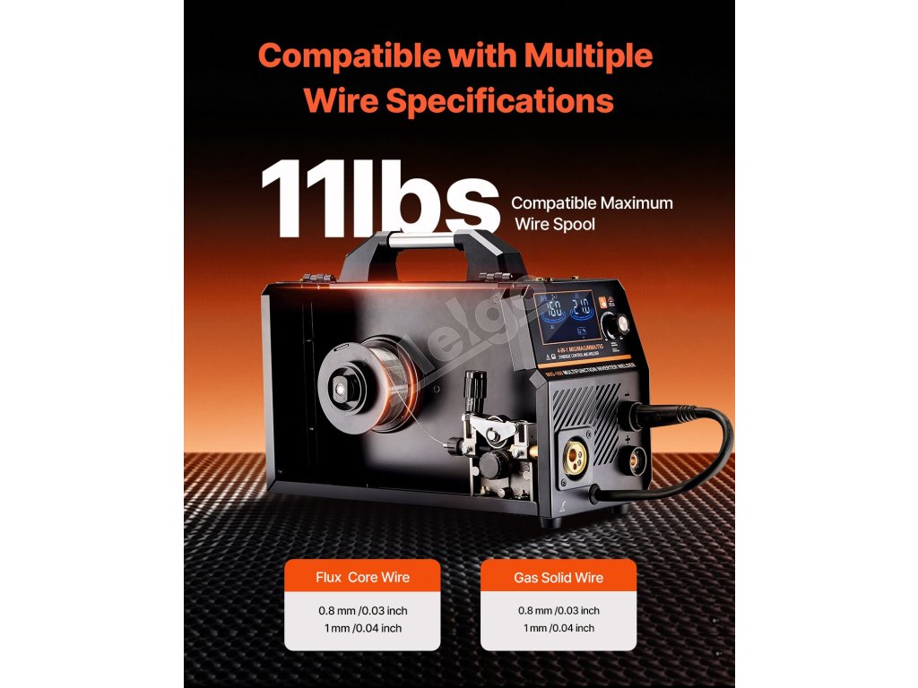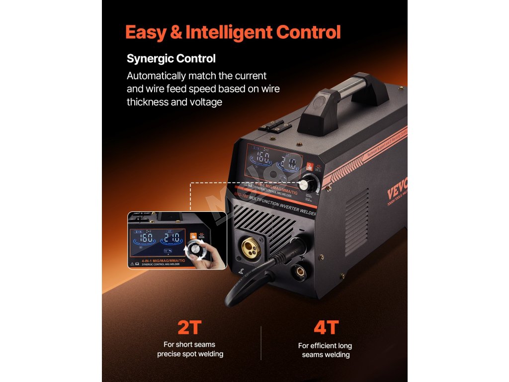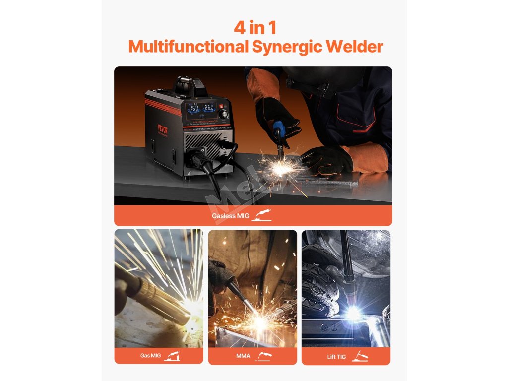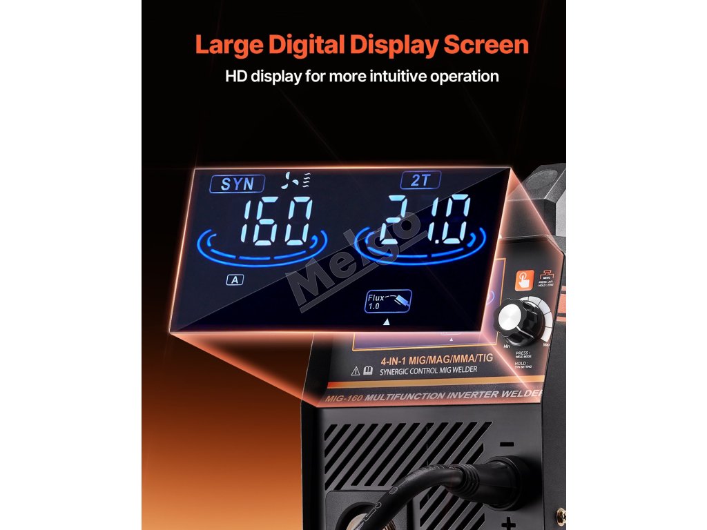 Táto 160A zváračka MIG 4 v 1 kombinuje všestrannosť, inteligentné ovládanie a vysoký výkon. Podporuje zváranie Lift TIG, MIG bez plynu, MIG v plyne a MMA, pričom výkonný výstupný prúd 160 A dokáže zvárať hrúbky až do 10 mm, čím poskytuje efektívne a pohodlné riešenie zvárania.