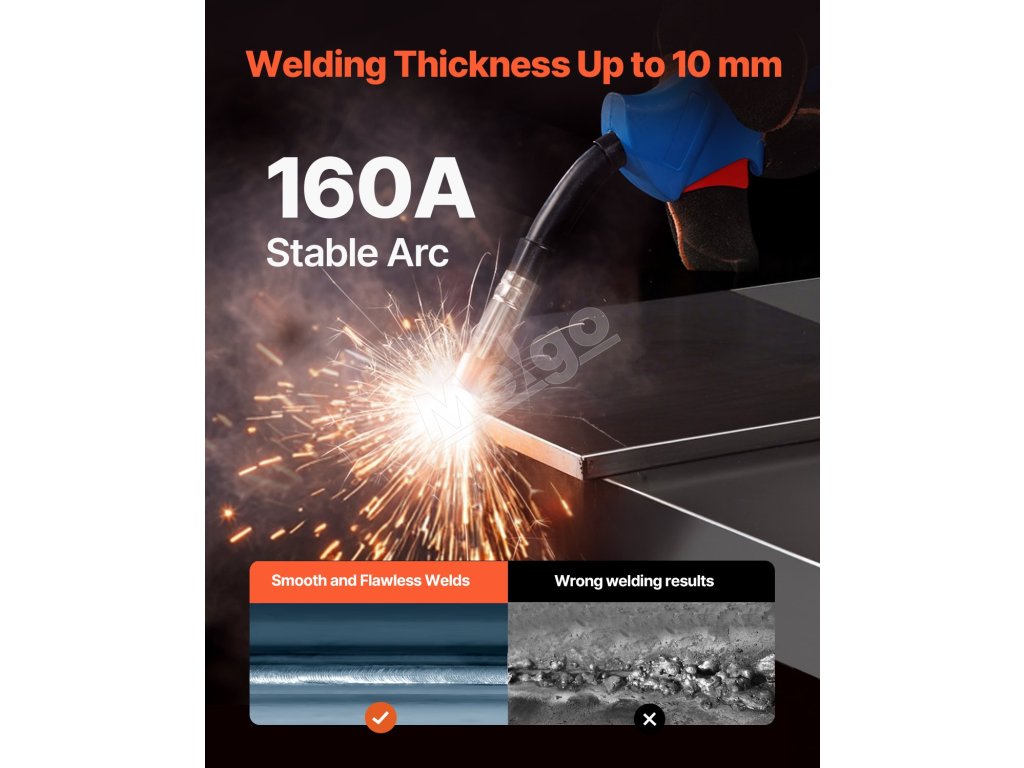 Táto zváračka poskytuje silný výstupný prúd 160 A, ktorý umožňuje zvárať materiály s hrúbkou až 10 mm. Je kompatibilná s rôznymi materiálmi vrátane mäkkej ocele, nehrdzavejúcej ocele, liatiny, plechu, štvorcových rúrok a kovovej klietky.