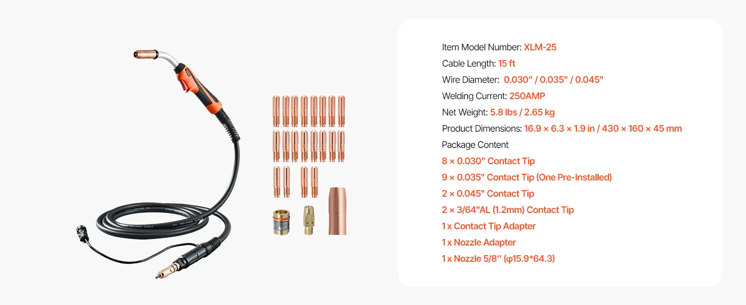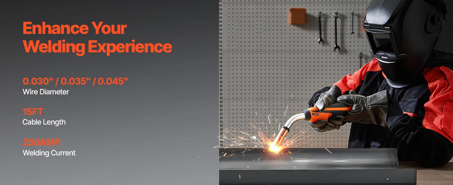 Zváracia pištoľ VEVOR 250A je vybavená 15ft vysokokvalitným káblom, kompatibilným so zváračkami Millermatic 200, 210, 212, 250, 250X, 251, 252. Podporuje drôty s priemerom 0,030", 0,035" a 0,045", čím zabezpečuje všestrannosť pri rôznych zváracích úlohách - ideálne pre profesionálov aj domácich majstrov.