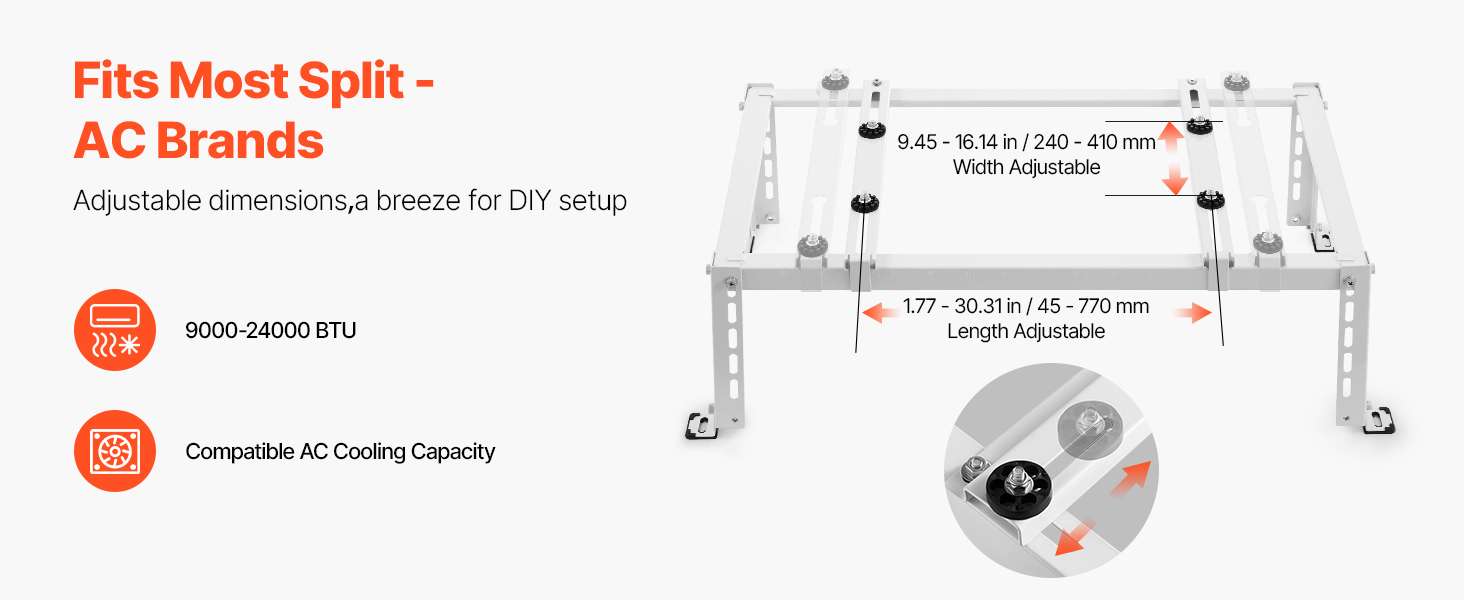 Táto základňa pre mini split je kompatibilná s väčšinou mini split klimatizačných jednotiek, čo zaručuje jednoduchú inštaláciu pre rôzne značky a modely zariadení.