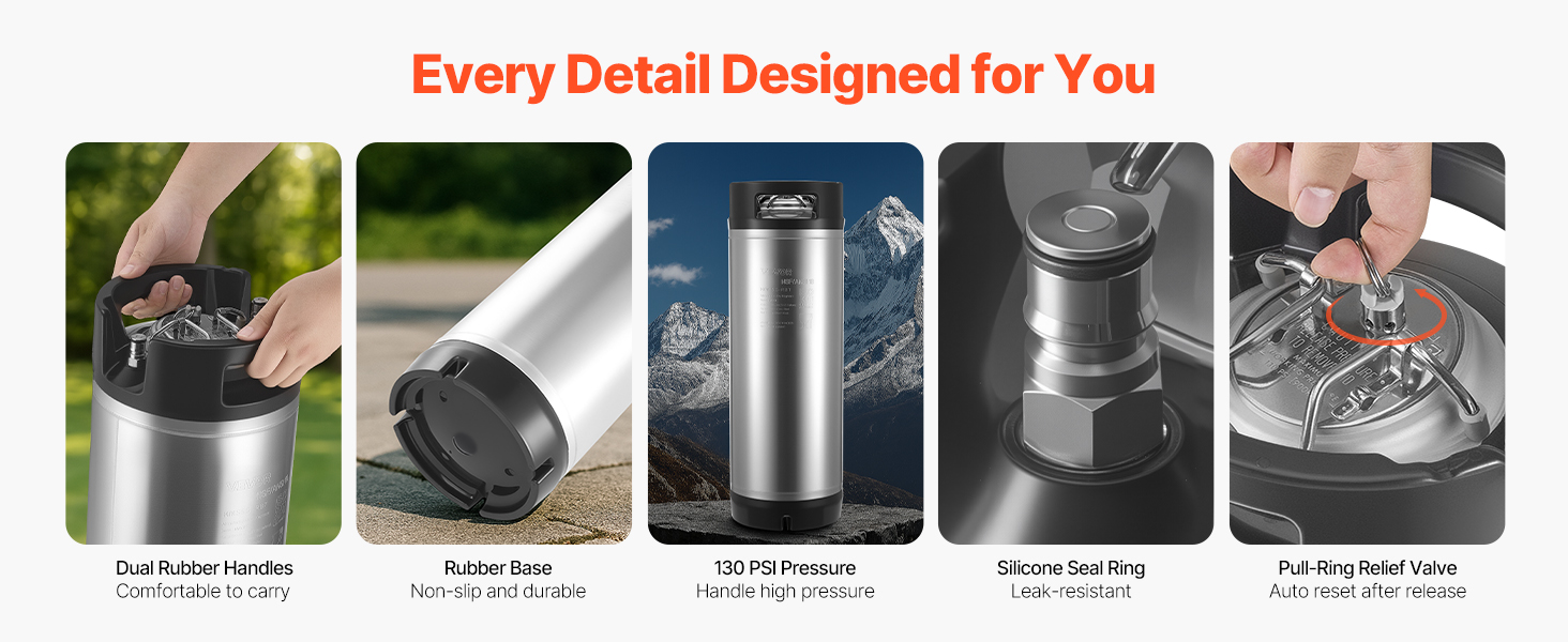 Tento súdok Cornelius ponúka manuálne aj automatické uvoľnenie tlaku pomocou sťahovacieho ventilu a silikónového krúžku, ktorý spoľahlivo tesní až do 130 PSI. Gumené rukoväte a podstavec poskytujú pohodlie pri pravidelnom používaní, či už pri varení, skladovaní alebo podávaní nápojov.