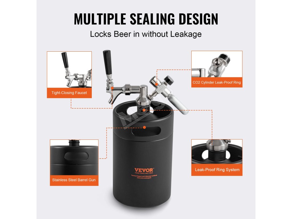 Vylepšená nepriepustná konštrukcia s viacerými nepriepustnými systémami zaisťuje tesné spojenie minibagra, zabraňuje úniku aj pri pretrepávaní alebo dlhodobom skladovaní a poskytuje uzavretý a neporušený priestor pre vaše pivo.