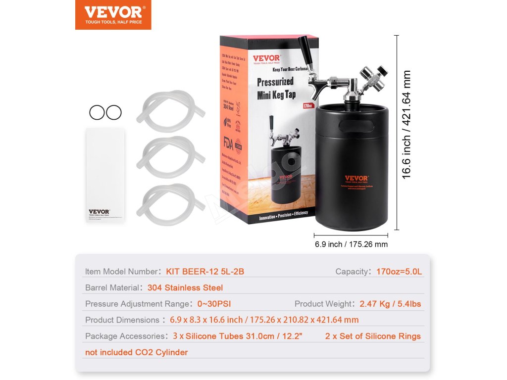 Tlakový growler na pivo 170Oz 5L, nerez 304, kohútik, co2 regulátor