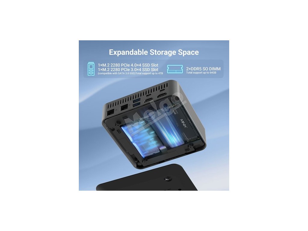 Systém vybavený dvoma slotmi DDR5 SO-DIMM s podporou až 96 GB zabezpečuje rýchly prístup k dátam a lepší multitasking. Dodáva sa s predinštalovaným SSD diskom M.2 PCIe 4.0x4 s kapacitou 1 TB, ktorý ponúka bleskové rýchlosti čítania/zápisu pre rýchle spustenie systému, bezproblémový prenos súborov a svižný výkon. Ďalší slot M.2 podporuje disky SSD PCIe 3.0x4 alebo SATA pre flexibilné rozšírenie úložiska.