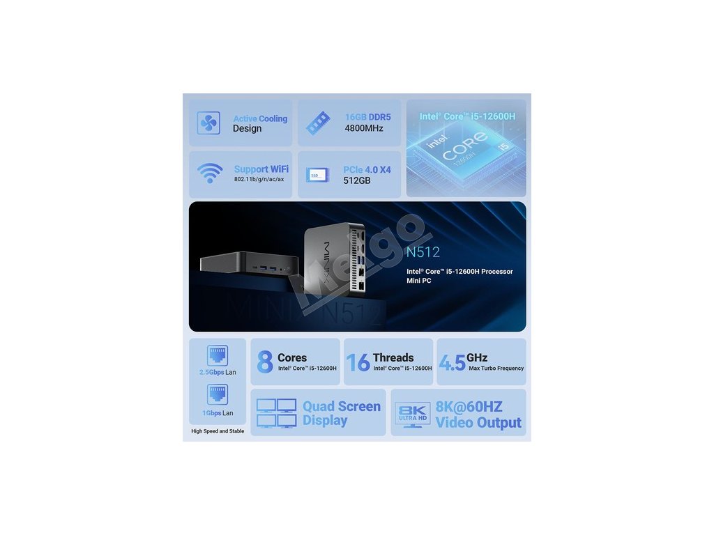 Mini PC MINIX N512 poháňaný procesorom 12. generácie Intel® Core™ i5-12600H s 18 MB vyrovnávacej pamäte a Turbo boostom až do 4,5 GHz poskytuje výkon na úrovni stolného počítača v kompaktnom prevedení. Je ideálny na multitasking, kancelársku produktivitu a náročné pracovné zaťaženie a zaručuje plynulý chod rôznych aplikácií.
