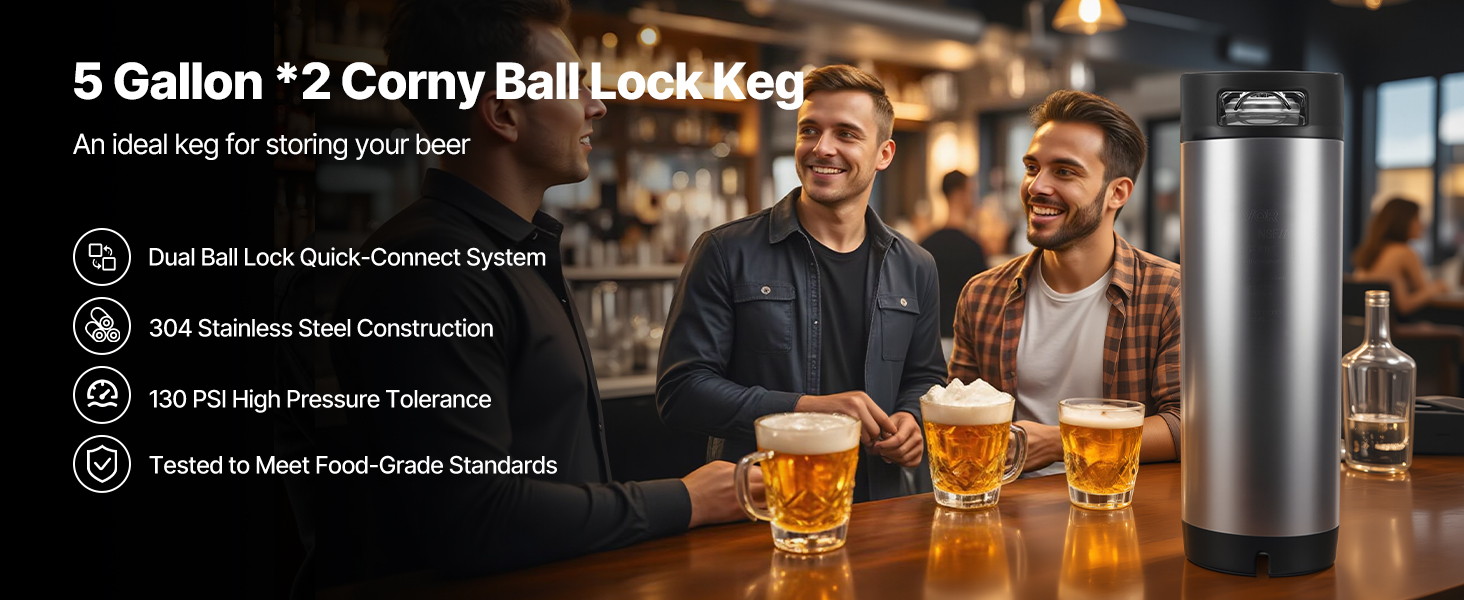 Tento 5galónový (19l) sud s guľovým uzáverom 2 ks je určený pre domácich pivovarníkov a výrobcov nápojov a ponúka rýchle nastavenie vďaka dvom rýchlospojkám. Ideálny na skladovanie piva, studeného moku alebo sódy pod stálym tlakom. Má telo z nehrdzavejúcej ocele 304, ktoré podporuje časté používanie doma, v kaviarňach alebo na podujatiach.
