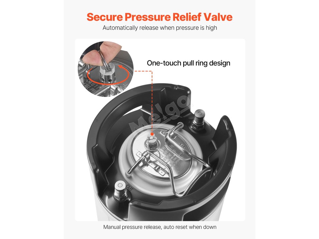 Tento súdok Cornelius ponúka manuálne aj automatické uvoľnenie tlaku pomocou sťahovacieho ventilu a silikónového krúžku, ktorý spoľahlivo tesní až do 130 PSI. Gumené rukoväte a podstavec poskytujú pohodlie pri pravidelnom používaní, či už pri varení, skladovaní alebo podávaní nápojov.