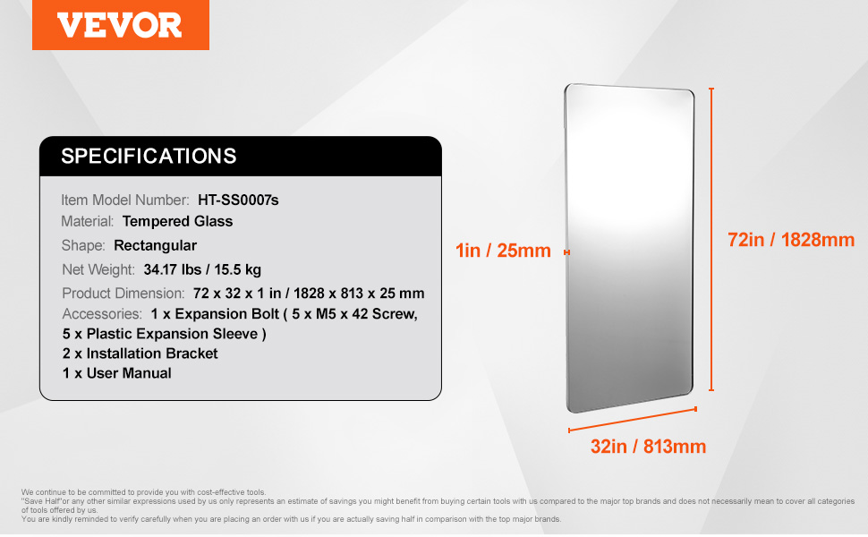 Nástenné zrkadlo 0.15" hr., 32"×72", hliníkový rám, bezpečná fólia