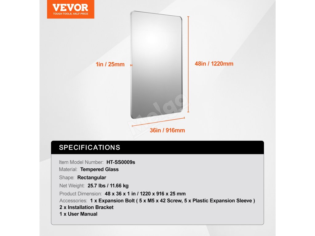 Nástenné zrkadlo na líčenie 0.15" 36"×48", z-tvarový držiak.