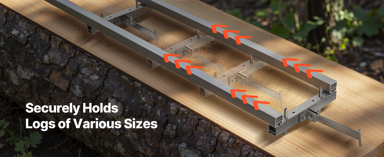 Vodiaci systém koľajnicovej frézy sa ľahko prispôsobí rôznym veľkostiam guľatiny, rýchlo ju upne na miesto a zakaždým zabezpečí presné a hladké horizontálne rezy.