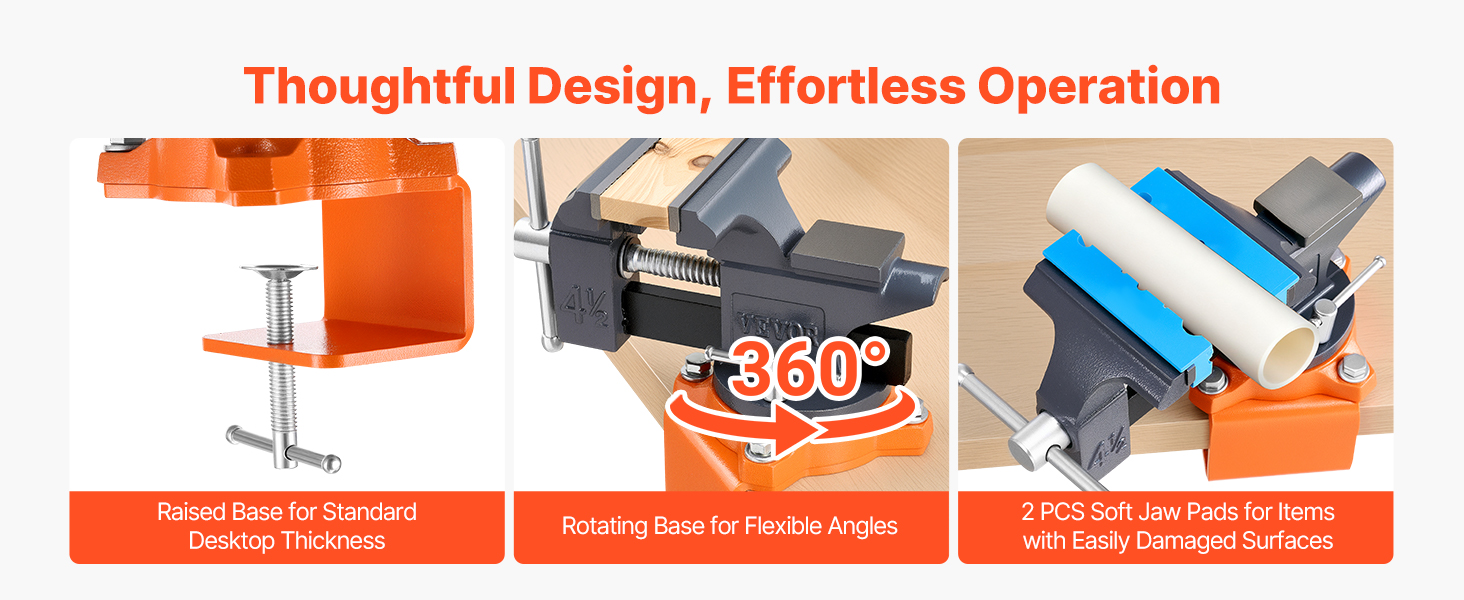 Prenosný domáci zverák má zvýšenú základňu, ktorá sa hodí na štandardné pracovné stoly. Jeho otočná konštrukcia umožňuje presné polohovanie pod viacerými uhlami, dokonca aj ľaváci môžu ľahko nastaviť uhol.