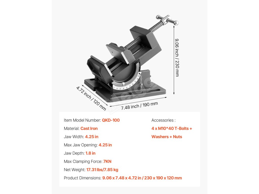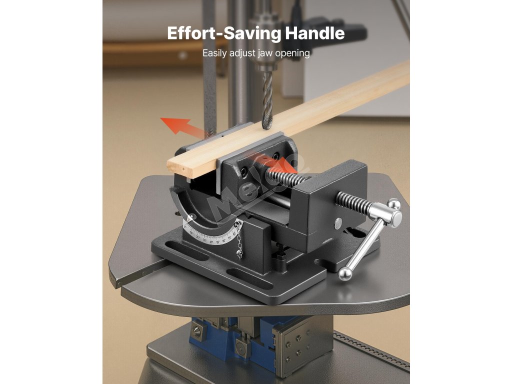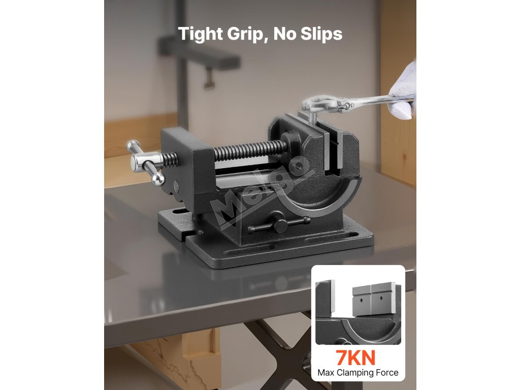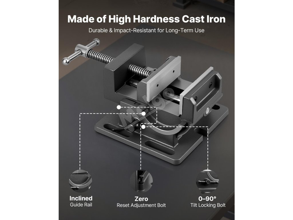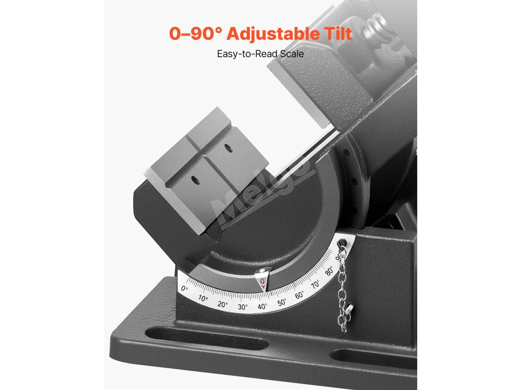 Tento sklopný zverák je vyrobený z vysokopevnostnej liatiny a má prehľadnú stupnicu na presné nastavenie uhla. Podporuje naklápanie v uhle 0-90°, čo je ideálne pre frézky, vŕtacie lisy a ďalšie zariadenia.