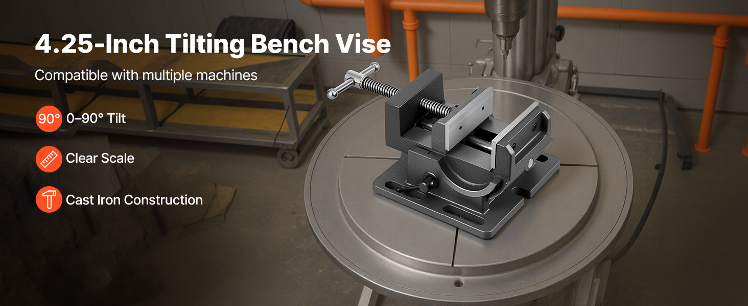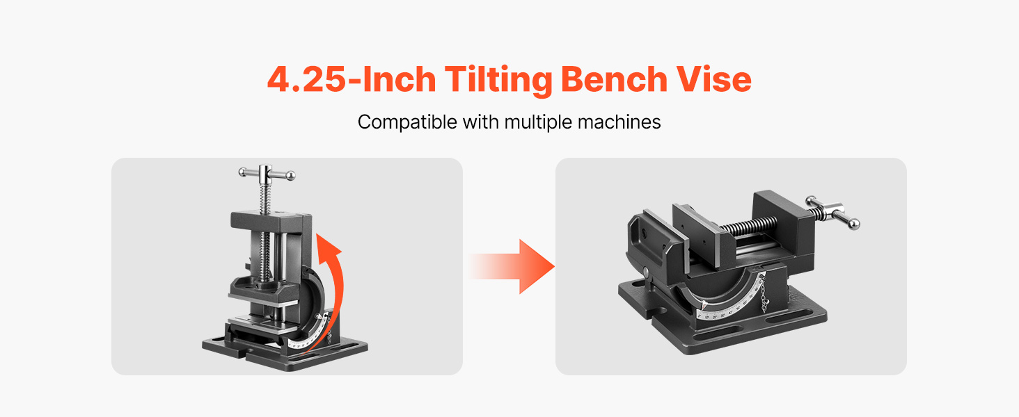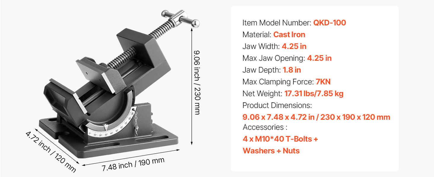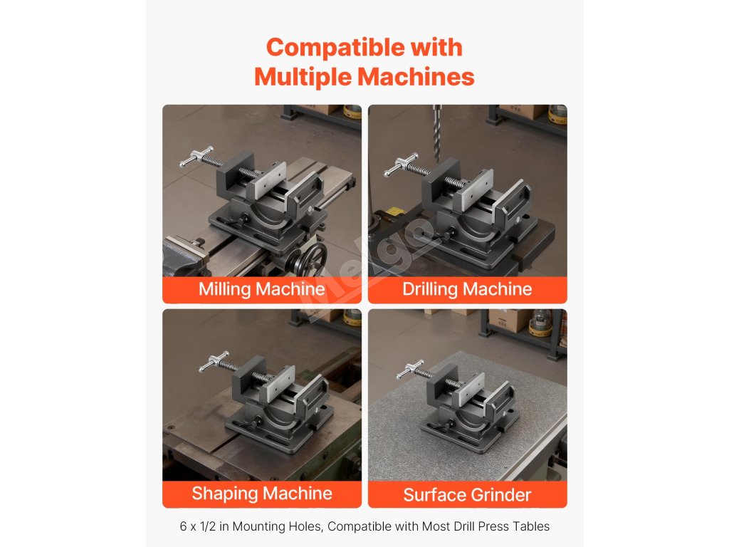 Tento sklopný zverák je vyrobený z vysokopevnostnej liatiny a má prehľadnú stupnicu na presné nastavenie uhla. Podporuje naklápanie v uhle 0-90°, čo je ideálne pre frézky, vŕtacie lisy a ďalšie zariadenia.