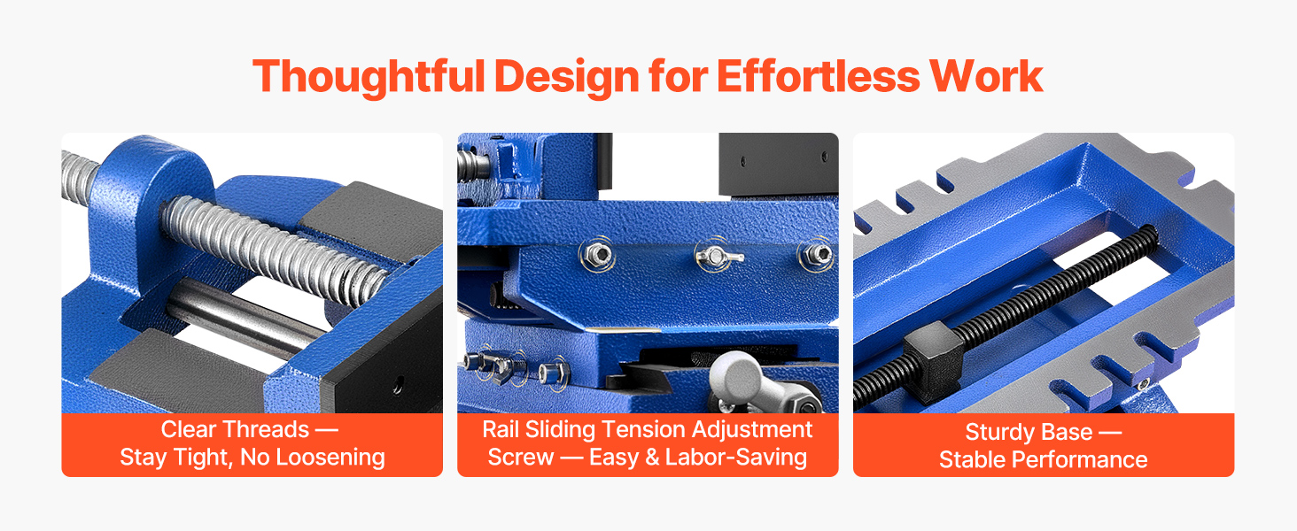 Náš vŕtací lisový zverák s osou X Y je vybavený priehľadnými závitmi, ktoré zostávajú pevné a odolné proti uvoľneniu, čo zaručuje stabilné upnutie. Robustná základňa poskytuje stabilitu počas prevádzky, čo umožňuje bezpečnú a spoľahlivú prácu.