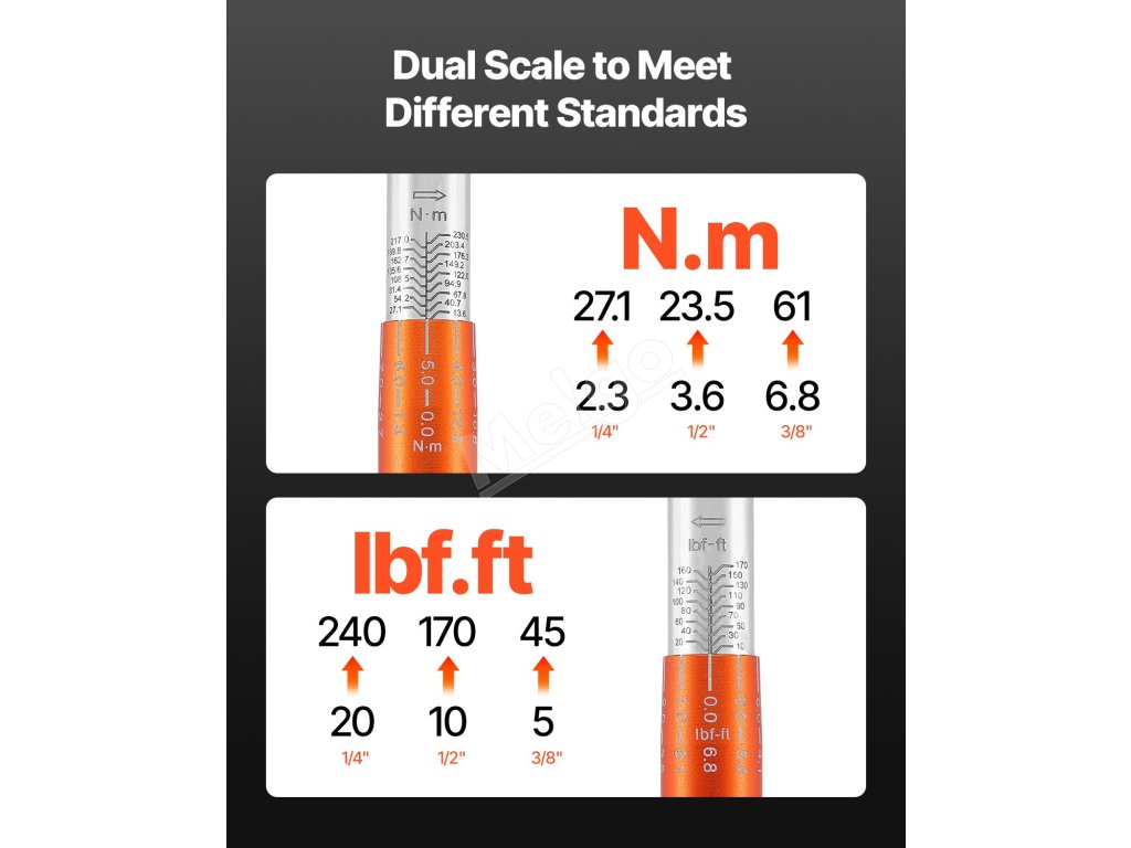 Dvojsmerný momentový kľúč je vybavený laserom vyrytými stupnicami na jasné a presné odčítanie hodnôt aj pri slabom osvetlení. Konštrukcia s dvoma stupnicami rozširuje všestrannosť kľúča, vďaka čomu je vhodný na širší rozsah úloh.