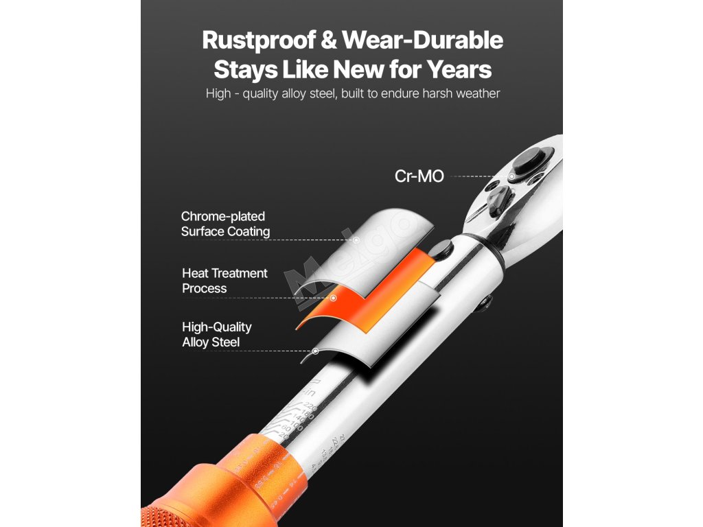 Tento momentový kľúč na cvakanie, vyrobený z vysokokvalitnej legovanej ocele a tepelne upravený s pochrómovaným povrchom, poskytuje výnimočnú pevnosť, presnosť a odolnosť, vďaka čomu je ideálnou voľbou na profesionálne upevňovacie úlohy.
