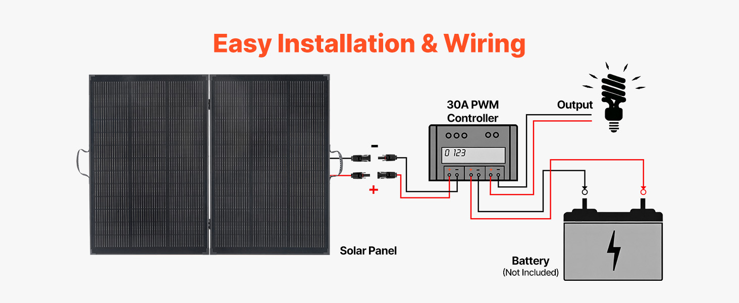 Náš monokryštalický solárny panel je vybavený stabilným výstupom MC4, 30A PWM regulátorom a krokosvorkami, ktoré umožňujú jednoduché pripojenie k vašim batériám a zabezpečujú stabilný a konzistentný výstup energie.