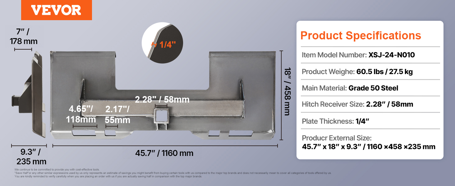 Prípojná doska pre skid steer 1/4" hrubá, 2.28" prípojka, 3000 lbs