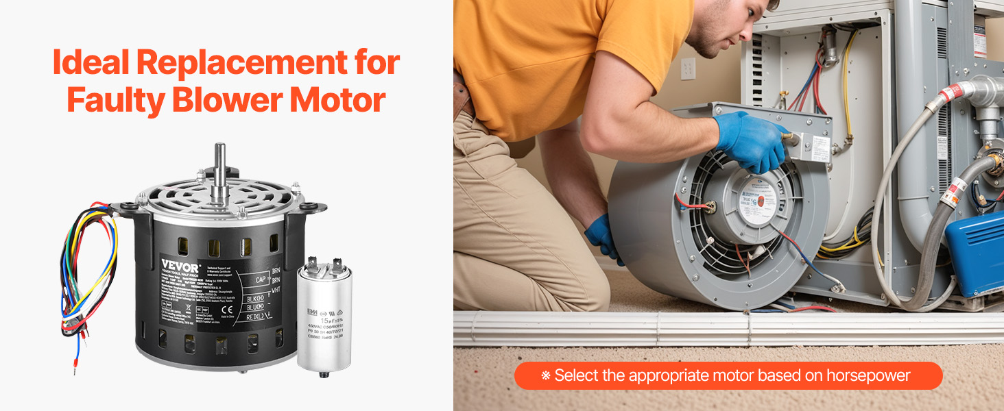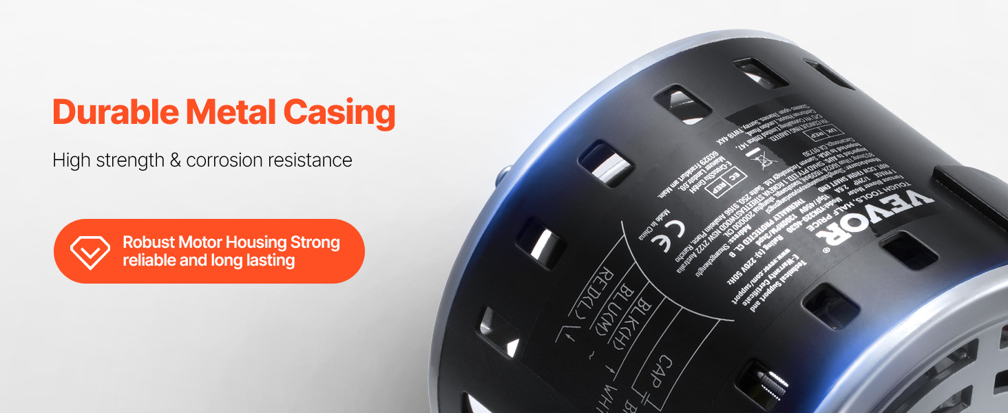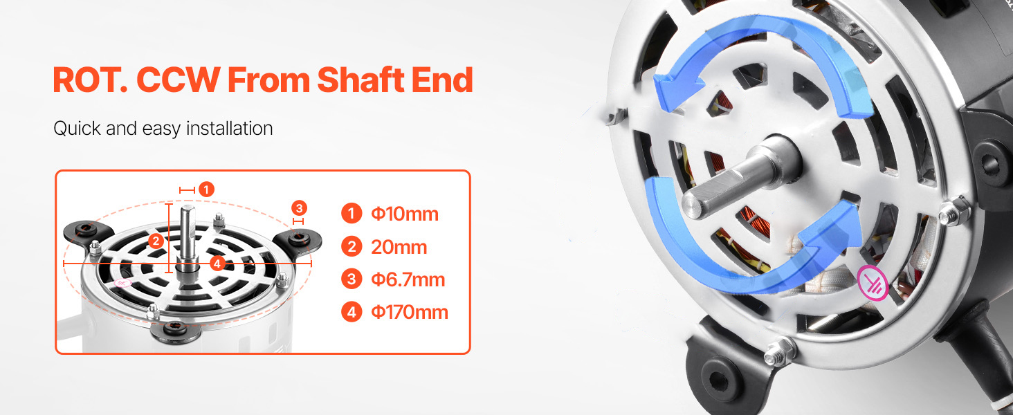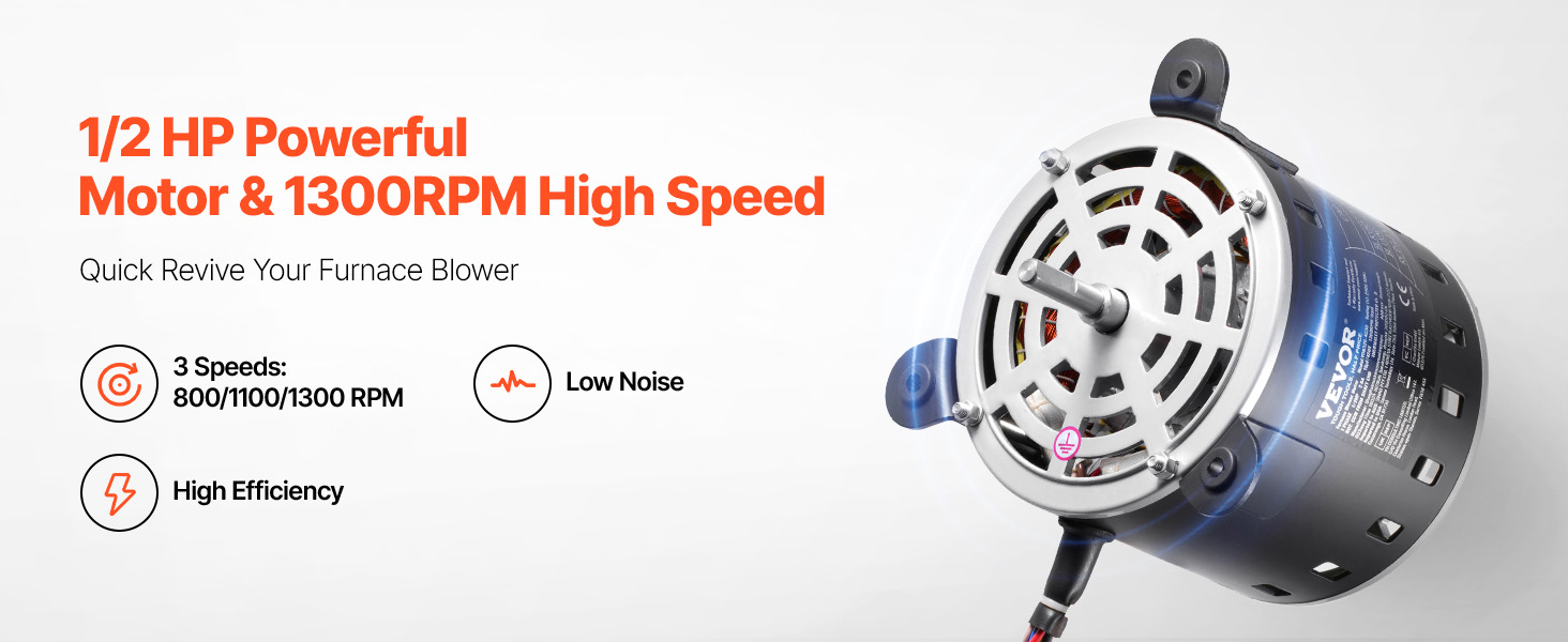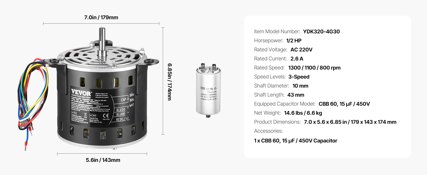 Motor ventilátora pece VEVOR 1/2HP má 3 rýchlosti (1300, 1100 a 800 ot./min.) a pracuje pri 220 V s prúdom 2,6A. S dĺžkou hriadeľa 20 mm, priemerom hriadeľa 10 mm, ROT. CCW od konca hriadeľa a kondenzátorom CBB60 15μF/450V je ideálnou voľbou pre klimatizačné kanálové systémy a pece.