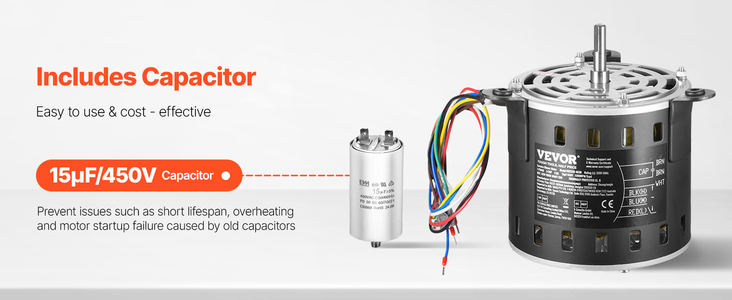 Tento motor je vybavený dodatočným príslušenstvom (kondenzátor CBB60 15μF/450V), vďaka čomu odpadajú problémy so samostatným hľadaním kompatibilných komponentov, a je tak pohodlnejší a pripravený na použitie!