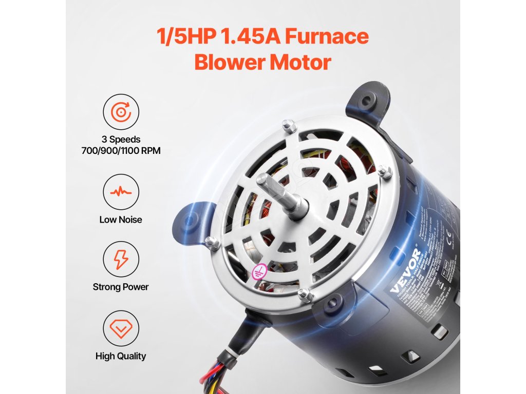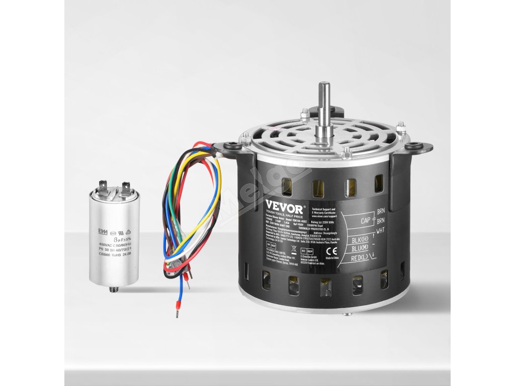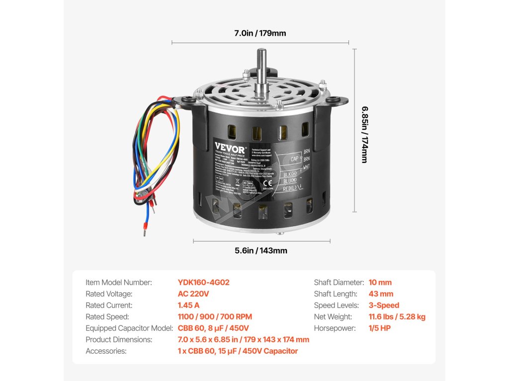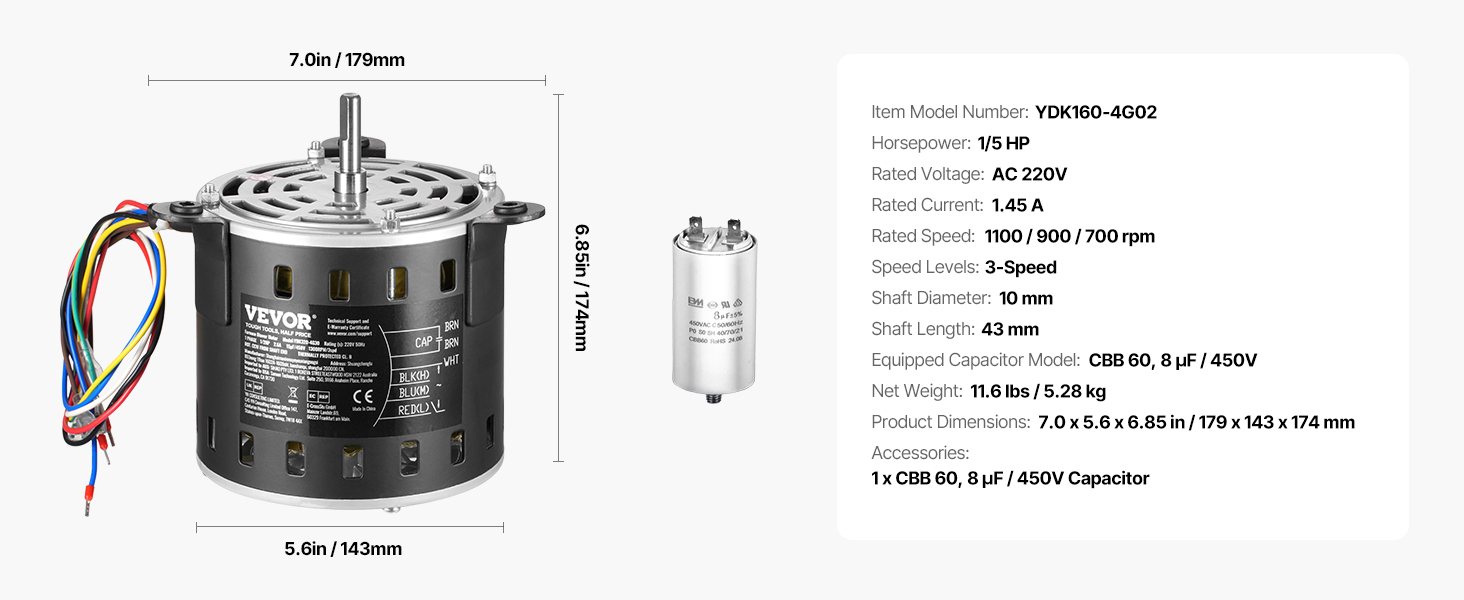 Motor ventilátora pece VEVOR 1/5HP má 3 rýchlosti (1100, 900 a 700 ot./min.) a pracuje pri 220 V s prúdom 1,45 A. S dĺžkou hriadeľa 20 mm, priemerom hriadeľa 10 mm, ROT. CCW od konca hriadeľa a kondenzátorom CBB60 8μF/450V je ideálnou voľbou pre klimatizačné kanálové systémy a pece.