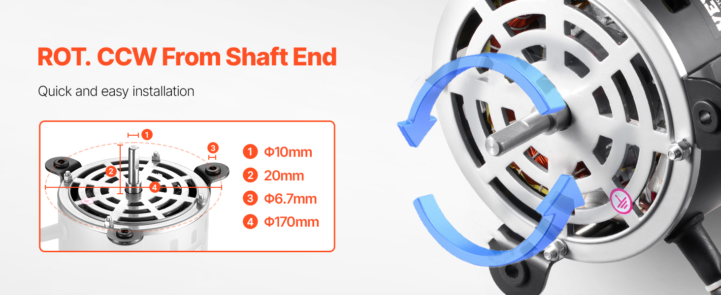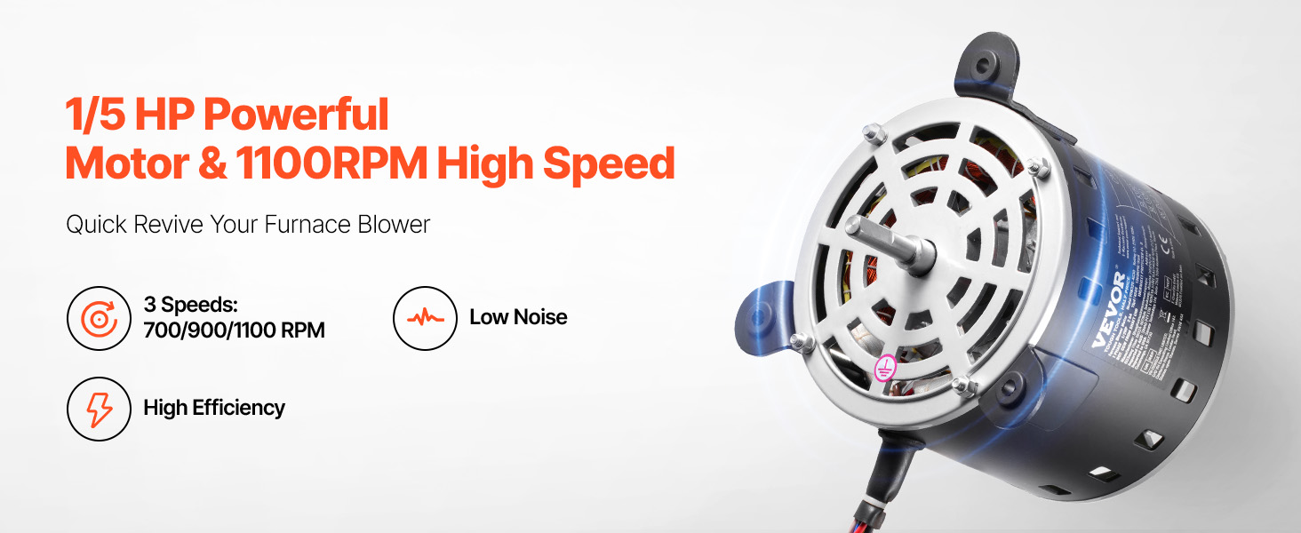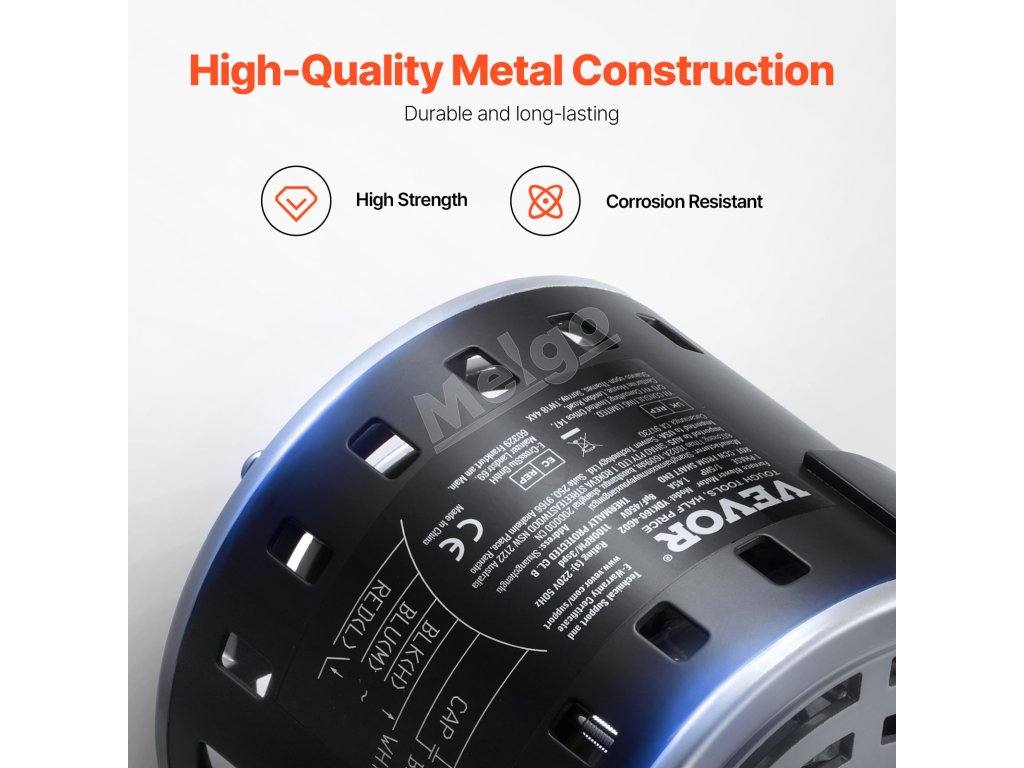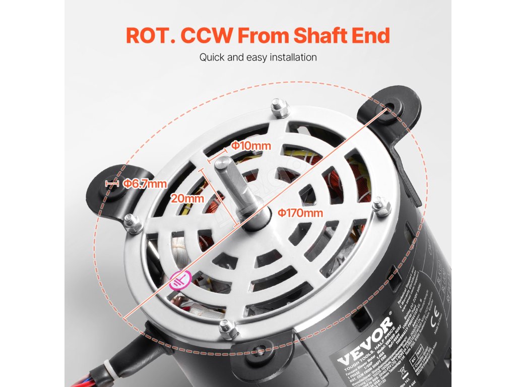 Motor ventilátora pece VEVOR 1/5HP má 3 rýchlosti (1100, 900 a 700 ot./min.) a pracuje pri 220 V s prúdom 1,45 A. S dĺžkou hriadeľa 20 mm, priemerom hriadeľa 10 mm, ROT. CCW od konca hriadeľa a kondenzátorom CBB60 8μF/450V je ideálnou voľbou pre klimatizačné kanálové systémy a pece.