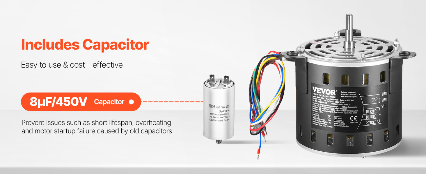 Tento motor je vybavený dodatočným príslušenstvom (kondenzátor CBB60 8μF/450V), vďaka čomu odpadajú problémy so samostatným hľadaním kompatibilných komponentov, a je tak pohodlnejší a pripravený na použitie!