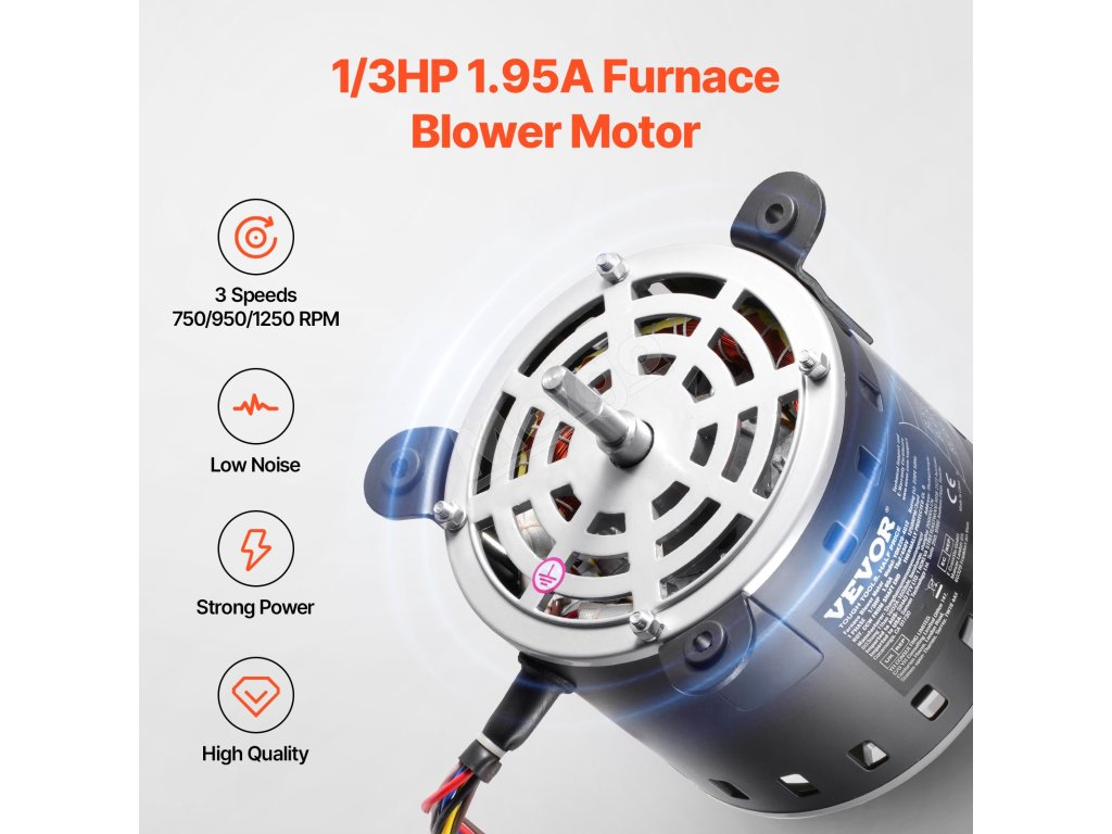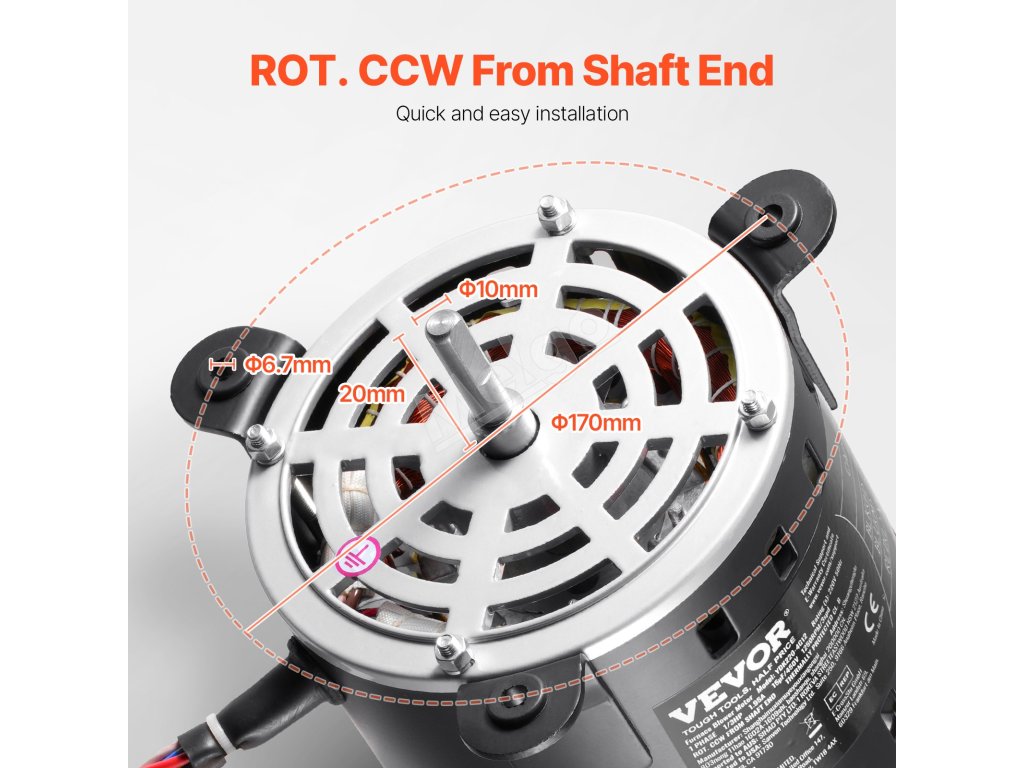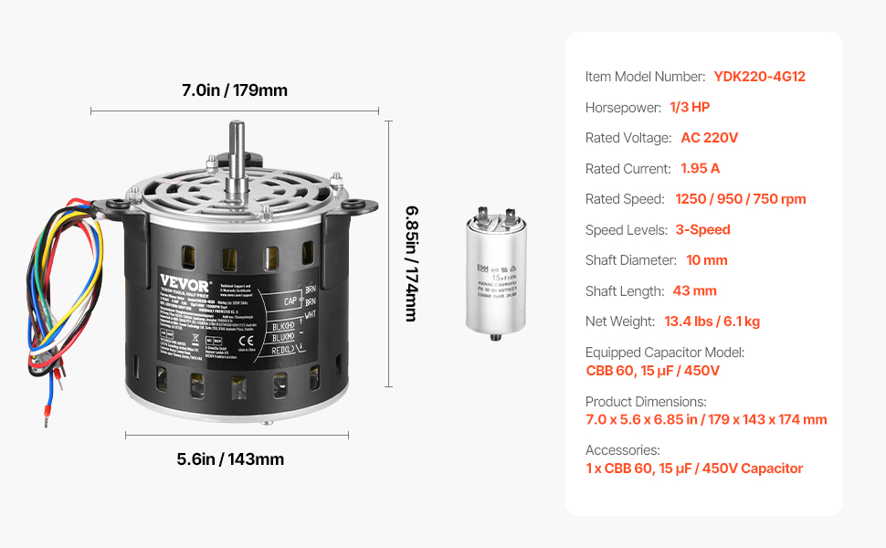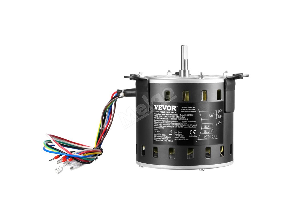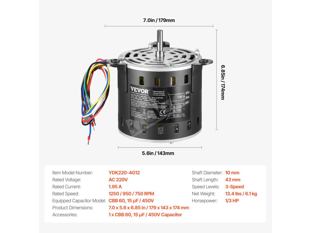 Motor ventilátora pece VEVOR 1/3HP má 3 rýchlosti (1250, 950 a 750 ot./min.) a pracuje pri 220 V s prúdom 1,95 A. S dĺžkou hriadeľa 20 mm, priemerom hriadeľa 10 mm, ROT. CCW od konca hriadeľa a kondenzátorom CBB60 15μF/450V je ideálnou voľbou pre klimatizačné kanálové systémy a pece.