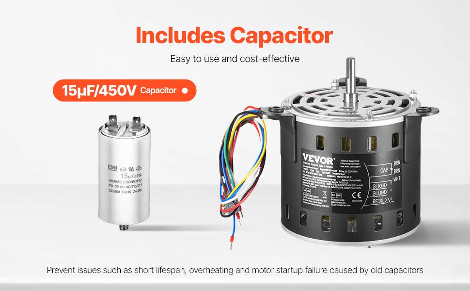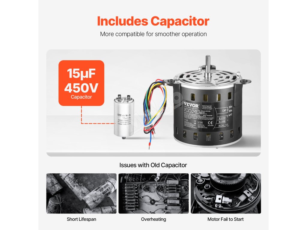 Tento motor je vybavený dodatočným príslušenstvom (kondenzátor CBB60 15μF/450V), vďaka čomu odpadajú problémy so samostatným hľadaním kompatibilných komponentov, a je tak pohodlnejší a pripravený na použitie!
