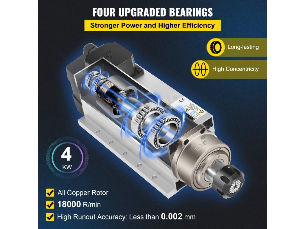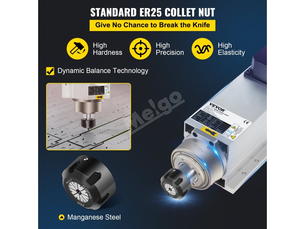 Na rozdiel od iných motorov frézovacích vretien používame inovatívnu a pokročilú technológiu dynamického vyvažovania. Výhodami štandardnej upínacej púzdra ER25 sú vynikajúca tuhosť, plná pevnosť, jedinečný dizajn odvodnenia a vysoká presnosť.