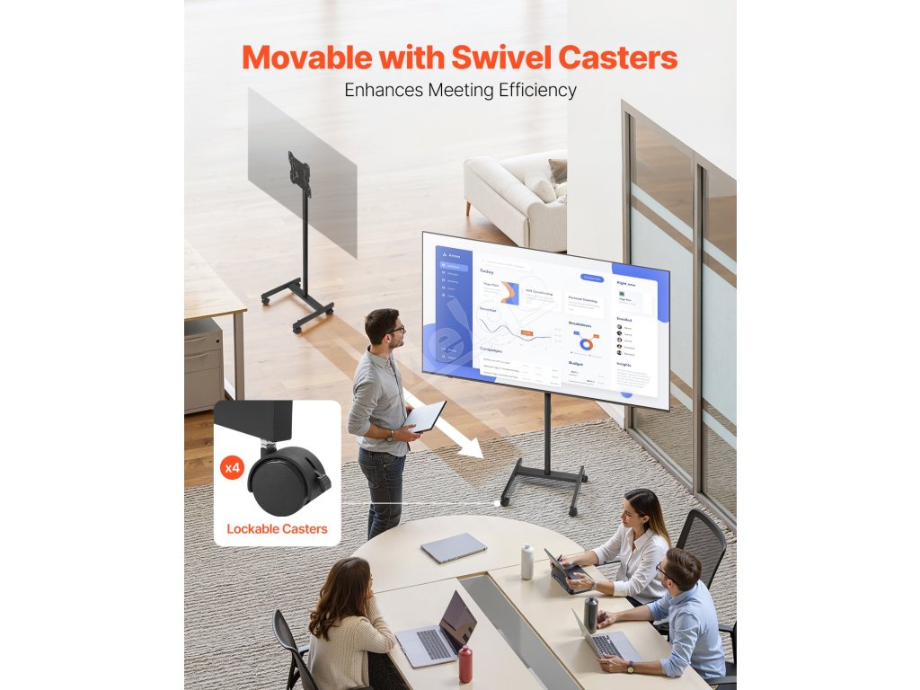 Náš mobilný držiak na televízor je vybavený otočnými kolieskami, ktoré umožňujú rýchle premiestňovanie televízora z jednej miestnosti do druhej.